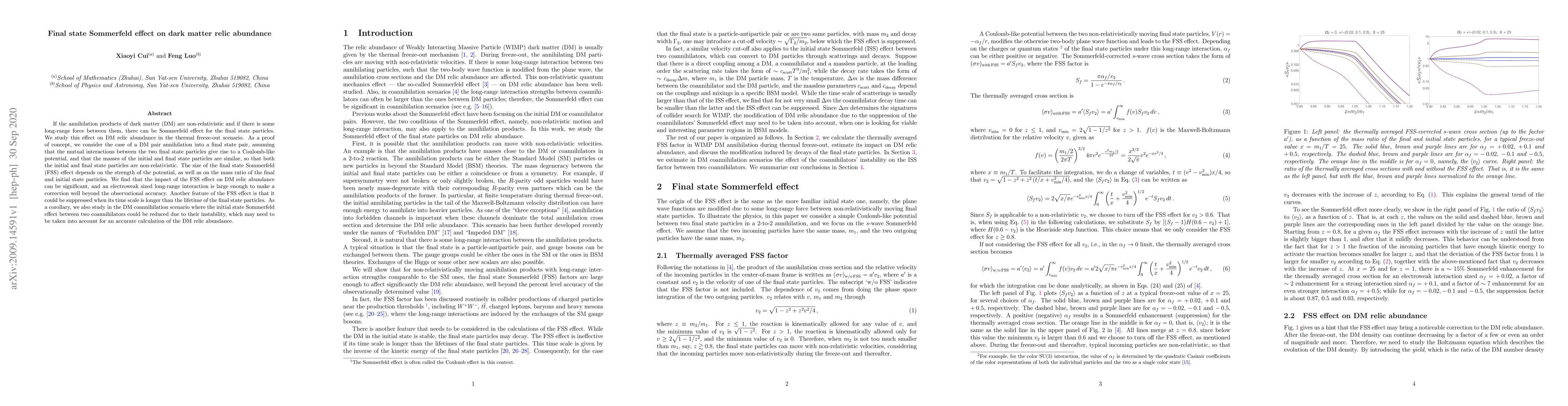 This paper investigates the final state Sommerfeld effect on dark matter (DM) relic abundance, finding that long-range interactions can significantly alter DM annihilation rates. It concludes that electroweak-sized forces can produce corrections beyond observational accuracy, and that the effect may be suppressed if the final state particles' lifetimes are shorter than the interaction time scale.