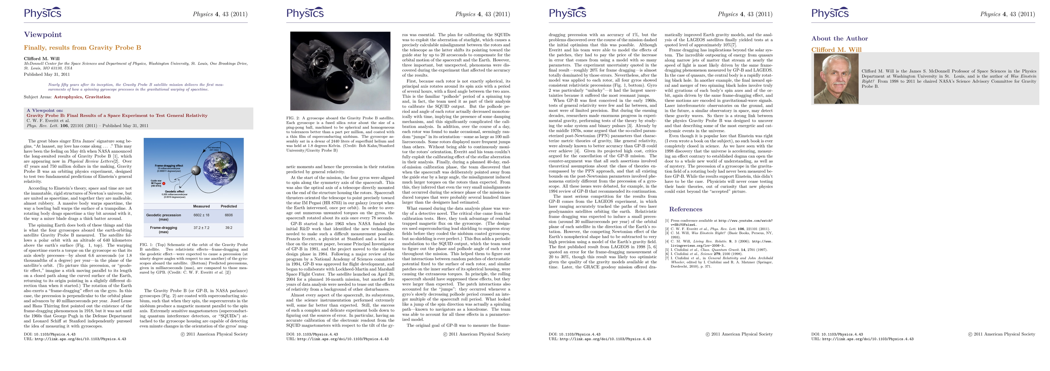 Summary: Gravity Probe B, launched nearly fifty years after its conception, provides the first empirical measurements of a spinning gyroscope's precession in the gravitational field, confirming theoretical predictions of spacetime warping.