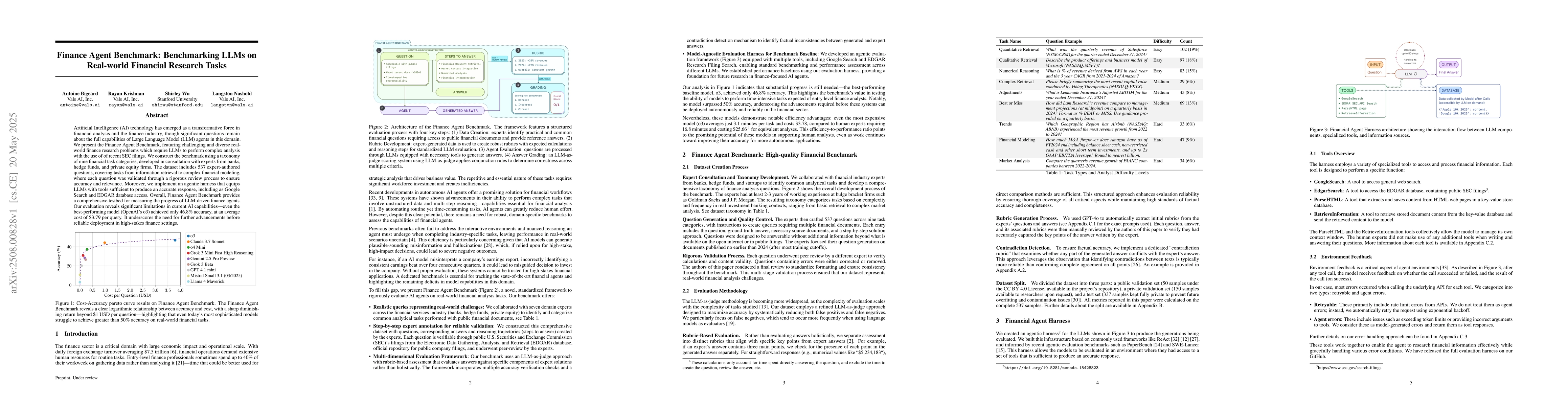 Artificial Intelligence (AI) technology has emerged as a transformative force in financial analysis and the finance industry, though significant questions remain about the full capabilities of Large Language Model (LLM) agents in this domain. We present the Finance Agent Benchmark, featuring challenging and diverse real-world finance research problems that require LLMs to perform complex analysis using recent SEC filings. We construct the benchmark using a taxonomy of nine financial task categories, developed in consultation with experts from banks, hedge funds, and private equity firms. The dataset includes 537 expert-authored questions covering tasks from information retrieval to complex financial modeling, each validated through a rigorous review process to ensure accuracy and relevance. Moreover, we implement an agentic harness that equips LLMs with tools sufficient to produce accurate responses, including Google Search and EDGAR database access. Overall, the Finance Agent Benchmark provides a comprehensive testbed for measuring the progress of LLM-driven finance agents. Our evaluation reveals significant limitations in current AI capabilities - even the best-performing model (OpenAI o3) achieved only 46.8% accuracy at an average cost of $3.79 per query. This underscores the need for further advancements before reliable deployment in high-stakes finance settings.