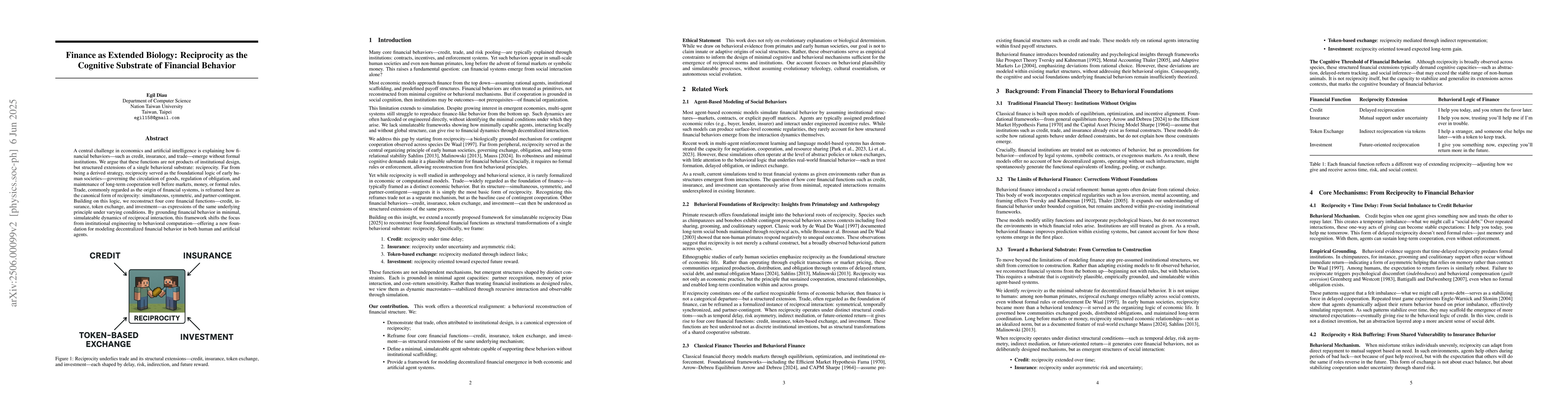 A central challenge in economics and artificial intelligence is explaining how financial behaviors-such as credit, insurance, and trade-emerge without formal institutions. We argue that these functions are not products of institutional design, but structured extensions of a single behavioral substrate: reciprocity. Far from being a derived strategy, reciprocity served as the foundational logic of early human societies-governing the circulation of goods, regulation of obligation, and maintenance of long-term cooperation well before markets, money, or formal rules. Trade, commonly regarded as the origin of financial systems, is reframed here as the canonical form of reciprocity: simultaneous, symmetric, and partner-contingent. Building on this logic, we reconstruct four core financial functions-credit, insurance, token exchange, and investment-as expressions of the same underlying principle under varying conditions. By grounding financial behavior in minimal, simulateable dynamics of reciprocal interaction, this framework shifts the focus from institutional engineering to behavioral computation-offering a new foundation for modeling decentralized financial behavior in both human and artificial agents.