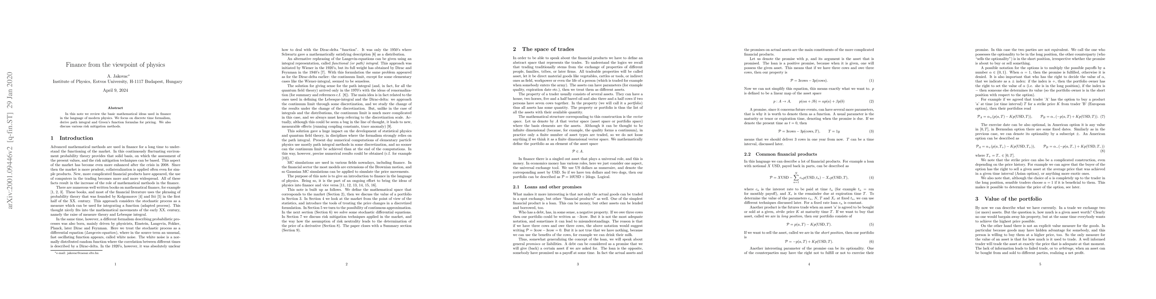 In this note we review the basic mathematical ideas used in finance in the language of modern physics. We focus on discrete time formalism, derive path integral and Green's function formulas for pricing. We also discuss various risk mitigation methods.