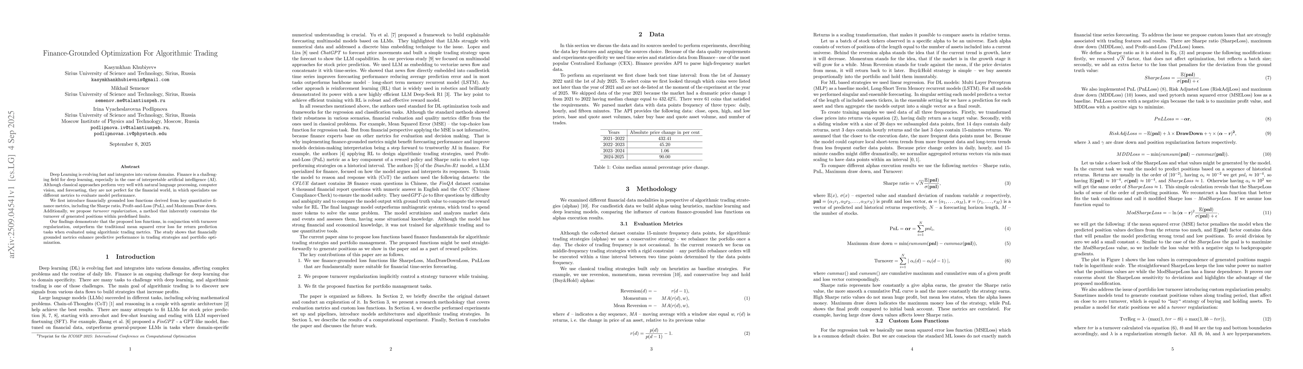 Deep Learning is evolving fast and integrates into various domains. Finance is a challenging field for deep learning, especially in the case of interpretable artificial intelligence (AI). Although classical approaches perform very well with natural language processing, computer vision, and forecasting, they are not perfect for the financial world, in which specialists use different metrics to evaluate model performance. We first introduce financially grounded loss functions derived from key quantitative finance metrics, including the Sharpe ratio, Profit-and-Loss (PnL), and Maximum Draw down. Additionally, we propose turnover regularization, a method that inherently constrains the turnover of generated positions within predefined limits. Our findings demonstrate that the proposed loss functions, in conjunction with turnover regularization, outperform the traditional mean squared error loss for return prediction tasks when evaluated using algorithmic trading metrics. The study shows that financially grounded metrics enhance predictive performance in trading strategies and portfolio optimization.