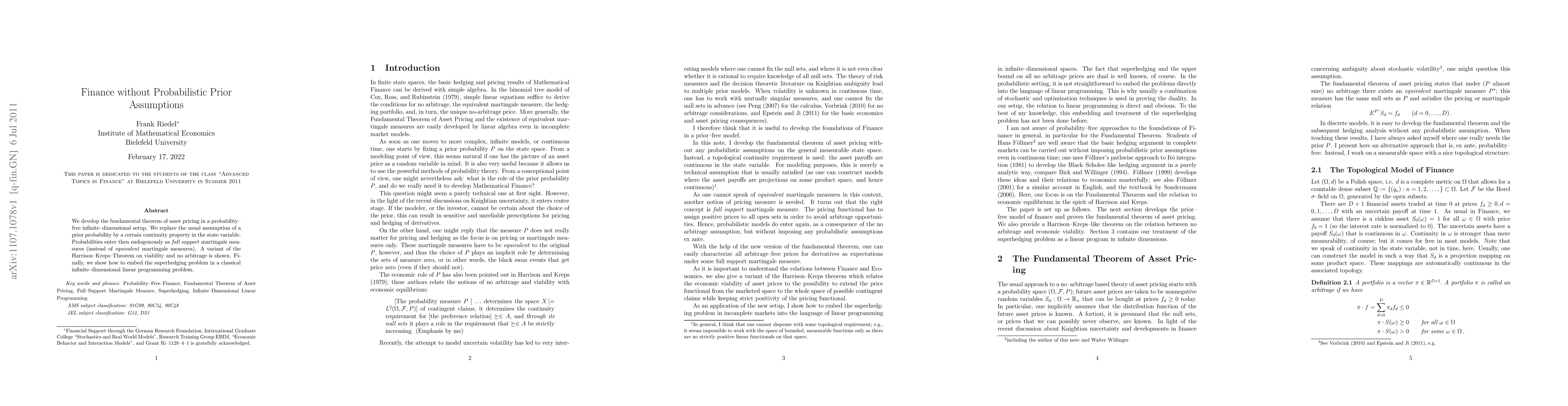 We develop the fundamental theorem of asset pricing in a probability-free infinite-dimensional setup. We replace the usual assumption of a prior probability by a certain continuity property in the state variable. Probabilities enter then endogenously as full support martingale measures (instead of equivalent martingale measures). A variant of the Harrison-Kreps-Theorem on viability and no arbitrage is shown. Finally, we show how to embed the superhedging problem in a classical infinite-dimensional linear programming problem.