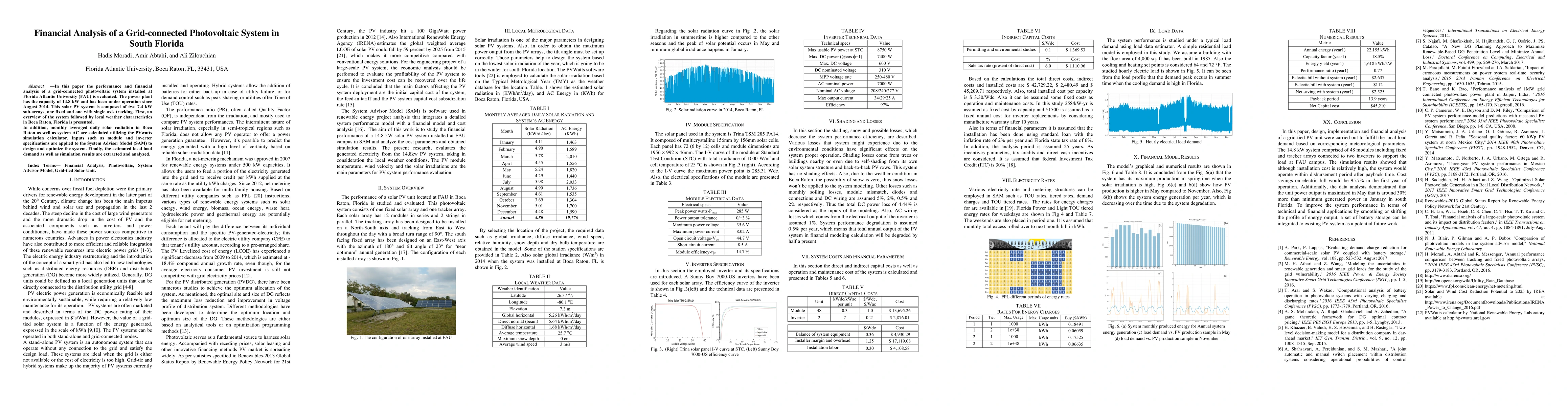 A 14.8 kW grid-connected photovoltaic system at Florida Atlantic University is analyzed for its performance and financial viability. The study uses simulations to estimate energy production and costs, providing valuable insights into the feasibility of solar power in South Florida.
