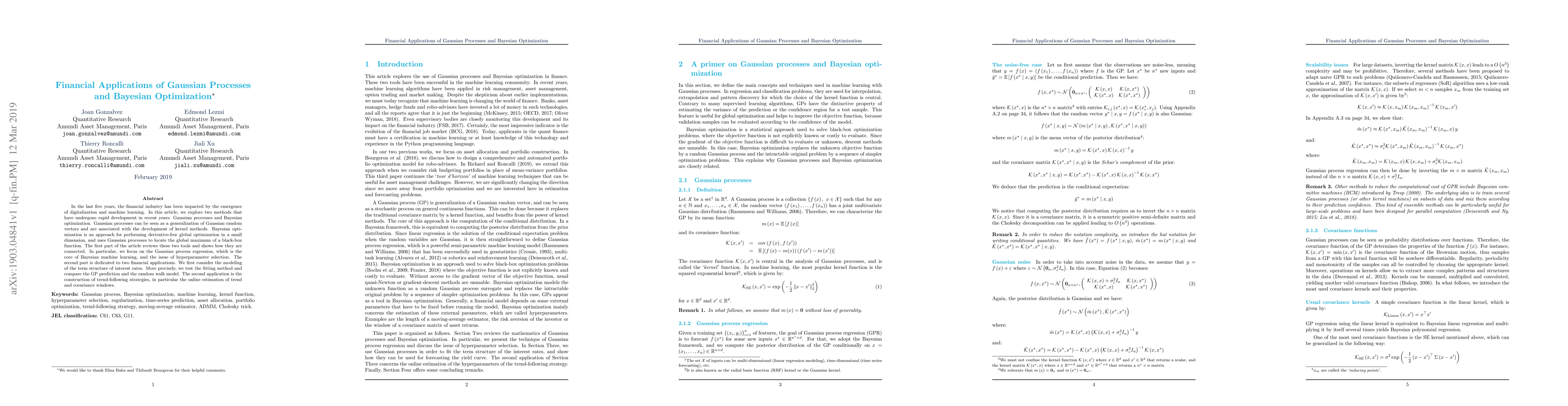 In the last five years, the financial industry has been impacted by the emergence of digitalization and machine learning. In this article, we explore two methods that have undergone rapid development in recent years: Gaussian processes and Bayesian optimization. Gaussian processes can be seen as a generalization of Gaussian random vectors and are associated with the development of kernel methods. Bayesian optimization is an approach for performing derivative-free global optimization in a small dimension, and uses Gaussian processes to locate the global maximum of a black-box function. The first part of the article reviews these two tools and shows how they are connected. In particular, we focus on the Gaussian process regression, which is the core of Bayesian machine learning, and the issue of hyperparameter selection. The second part is dedicated to two financial applications. We first consider the modeling of the term structure of interest rates. More precisely, we test the fitting method and compare the GP prediction and the random walk model. The second application is the construction of trend-following strategies, in particular the online estimation of trend and covariance windows.