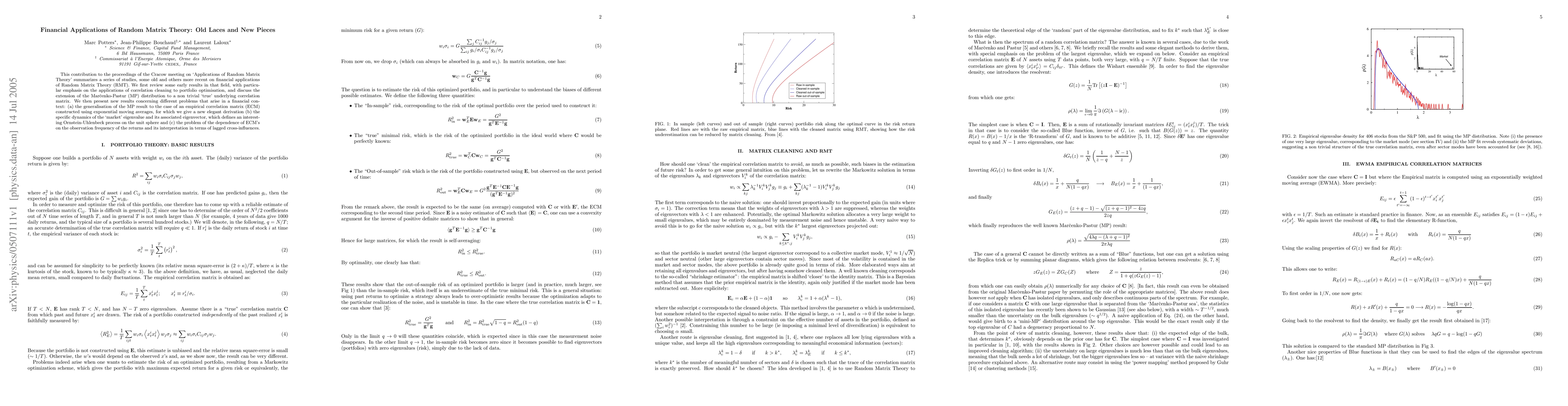 This paper reviews and extends financial applications of Random Matrix Theory, focusing on portfolio optimization and the Marcenko-Pastur distribution. It introduces novel results including the generalization of the MP result to empirical correlation matrices, dynamics of market eigenvalues, and the impact of observation frequency on correlation matrices.