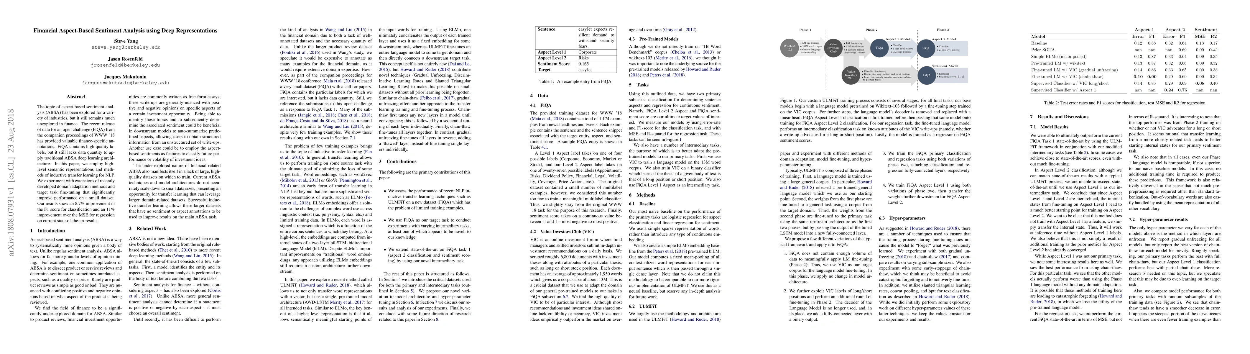 The topic of aspect-based sentiment analysis (ABSA) has been explored for a variety of industries, but it still remains much unexplored in finance. The recent release of data for an open challenge (FiQA) from the companion proceedings of WWW '18 has provided valuable finance-specific annotations. FiQA contains high quality labels, but it still lacks data quantity to apply traditional ABSA deep learning architecture. In this paper, we employ high-level semantic representations and methods of inductive transfer learning for NLP. We experiment with extensions of recently developed domain adaptation methods and target task fine-tuning that significantly improve performance on a small dataset. Our results show an 8.7% improvement in the F1 score for classification and an 11% improvement over the MSE for regression on current state-of-the-art results.