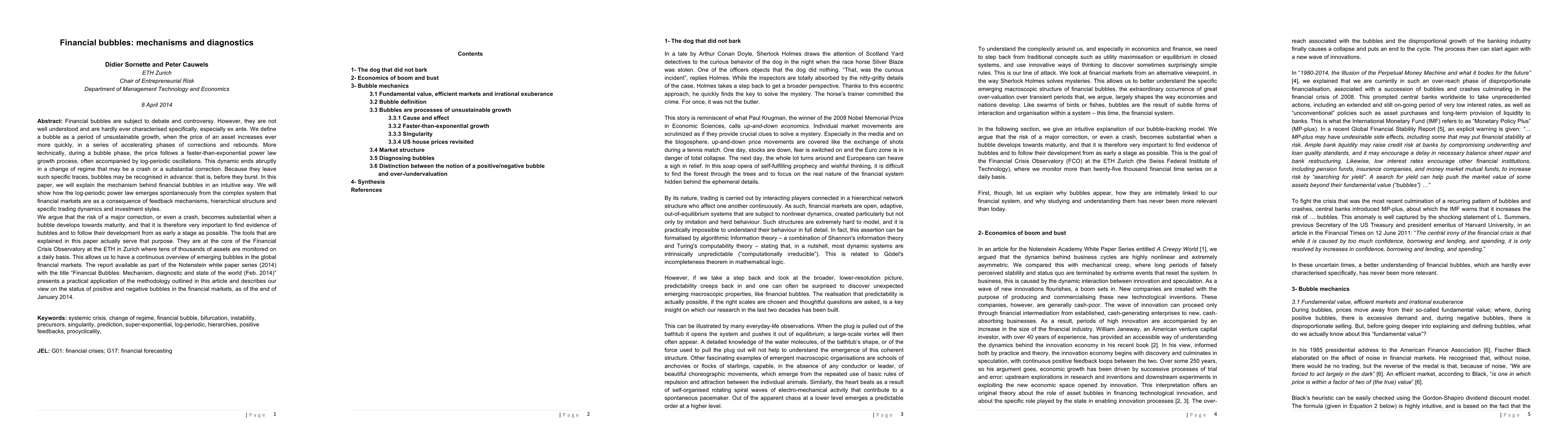 This paper explores the mechanisms behind financial bubbles, characterized by unsustainable, accelerating price growth, and proposes diagnostic tools to detect them early. It explains how log-periodic power law growth emerges from market dynamics and emphasizes the importance of monitoring bubbles to prevent major market corrections or crashes.