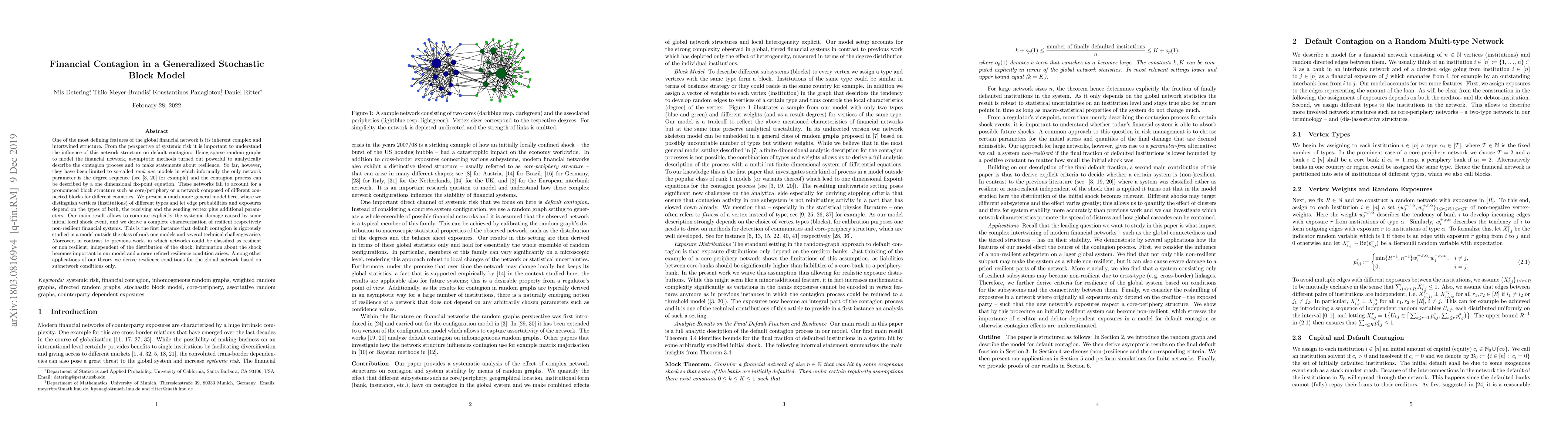 This paper introduces a generalized stochastic block model to analyze financial contagion, moving beyond traditional "rank one" models. It explicitly computes systemic damage from local shocks and provides a refined resilience condition that depends on the shock distribution, offering new insights into the resilience of financial networks.