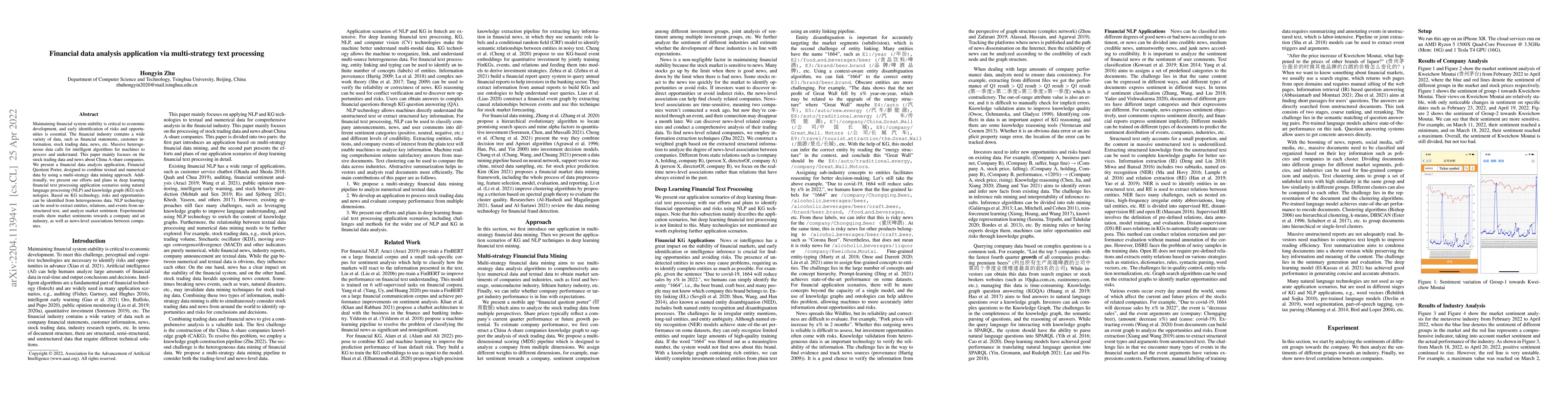 Maintaining financial system stability is critical to economic development, and early identification of risks and opportunities is essential. The financial industry contains a wide variety of data, such as financial statements, customer information, stock trading data, news, etc. Massive heterogeneous data calls for intelligent algorithms for machines to process and understand. This paper mainly focuses on the stock trading data and news about China A-share companies. We present a financial data analysis application, Financial Quotient Porter, designed to combine textual and numerical data by using a multi-strategy data mining approach. Additionally, we present our efforts and plans in deep learning financial text processing application scenarios using natural language processing (NLP) and knowledge graph (KG) technologies. Based on KG technology, risks and opportunities can be identified from heterogeneous data. NLP technology can be used to extract entities, relations, and events from unstructured text, and analyze market sentiment. Experimental results show market sentiments towards a company and an industry, as well as news-level associations between companies.