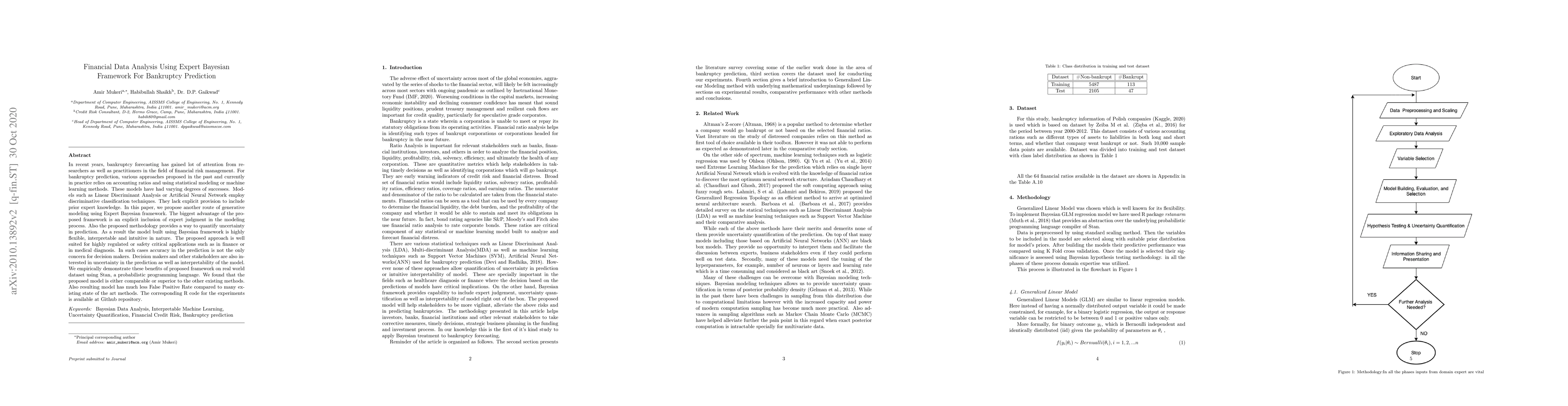 This paper proposes a generative modeling approach using an Expert Bayesian framework for bankruptcy prediction, emphasizing the inclusion of expert knowledge and the quantification of prediction uncertainty. The model demonstrates flexibility, interpretability, and lower false positive rates compared to existing methods, making it suitable for regulated fields where decision-making relies on both accuracy and model transparency.