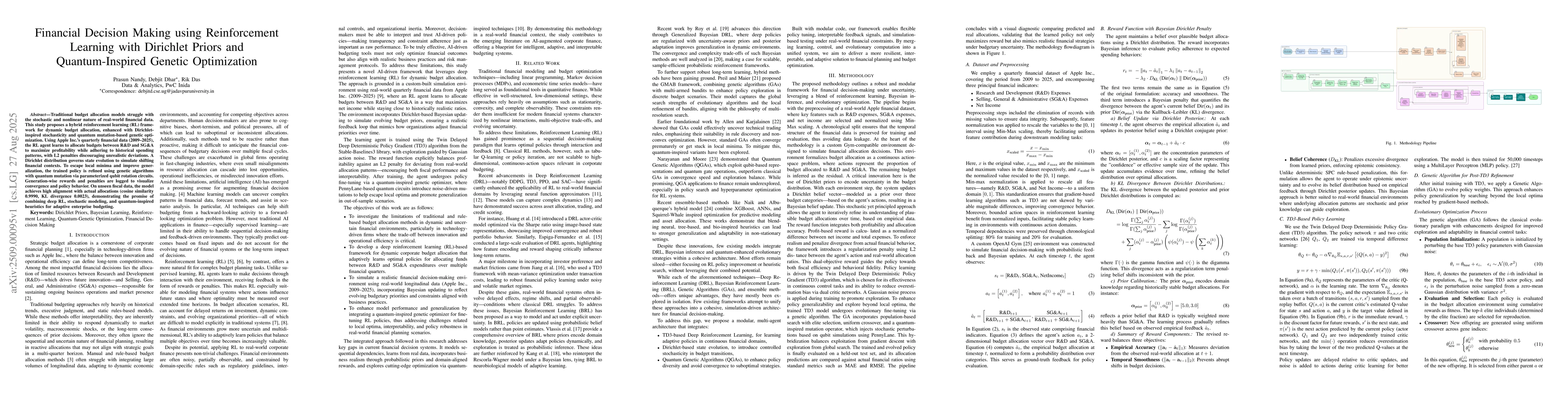 Traditional budget allocation models struggle with the stochastic and nonlinear nature of real-world financial data. This study proposes a hybrid reinforcement learning (RL) framework for dynamic budget allocation, enhanced with Dirichlet-inspired stochasticity and quantum mutation-based genetic optimization. Using Apple Inc. quarterly financial data (2009 to 2025), the RL agent learns to allocate budgets between Research and Development and Selling, General and Administrative to maximize profitability while adhering to historical spending patterns, with L2 penalties discouraging unrealistic deviations. A Dirichlet distribution governs state evolution to simulate shifting financial contexts. To escape local minima and improve generalization, the trained policy is refined using genetic algorithms with quantum mutation via parameterized qubit rotation circuits. Generation-wise rewards and penalties are logged to visualize convergence and policy behavior. On unseen fiscal data, the model achieves high alignment with actual allocations (cosine similarity 0.9990, KL divergence 0.0023), demonstrating the promise of combining deep RL, stochastic modeling, and quantum-inspired heuristics for adaptive enterprise budgeting.