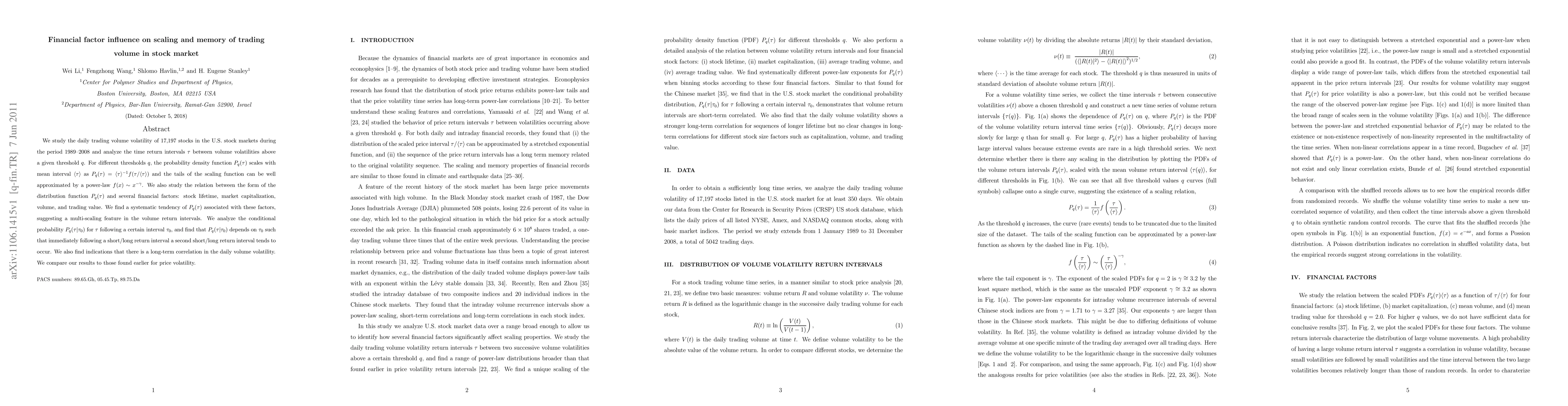 We study the daily trading volume volatility of 17,197 stocks in the U.S. stock markets during the period 1989--2008 and analyze the time return intervals $\tau$ between volume volatilities above a given threshold q. For different thresholds q, the probability density function P_q(\tau) scales with mean interval <\tau> as P_q(\tau)=<\tau>^{-1}f(\tau/<\tau>) and the tails of the scaling function can be well approximated by a power-law f(x)~x^{-\gamma}. We also study the relation between the form of the distribution function P_q(\tau) and several financial factors: stock lifetime, market capitalization, volume, and trading value. We find a systematic tendency of P_q(\tau) associated with these factors, suggesting a multi-scaling feature in the volume return intervals. We analyze the conditional probability P_q(\tau|\tau_0) for $\tau$ following a certain interval \tau_0, and find that P_q(\tau|\tau_0) depends on \tau_0 such that immediately following a short/long return interval a second short/long return interval tends to occur. We also find indications that there is a long-term correlation in the daily volume volatility. We compare our results to those found earlier for price volatility.