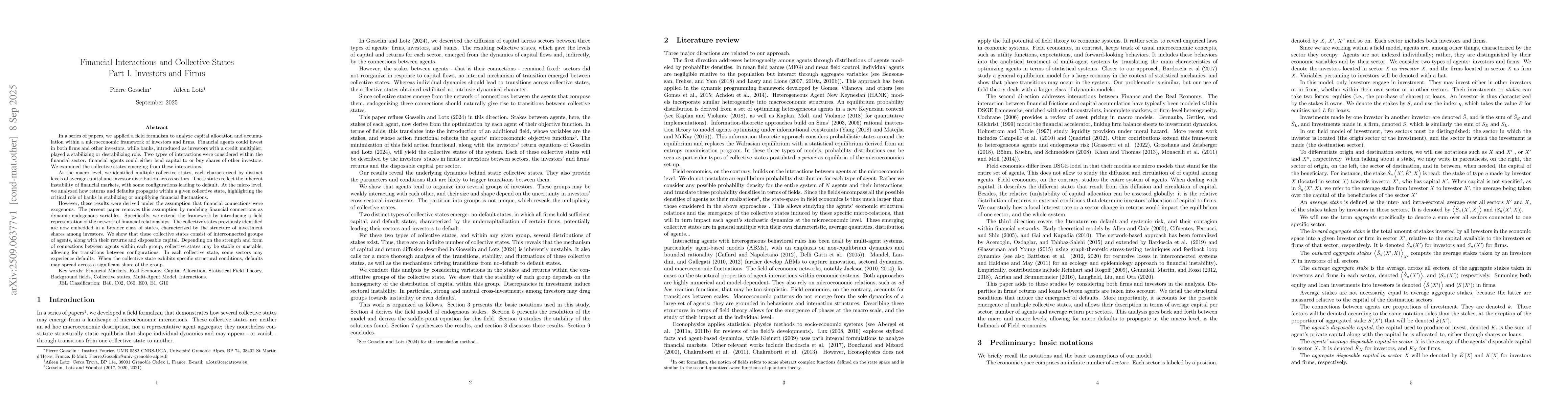 In a series of papers, we applied a field formalism to analyze capital allocation and accumulation within a microeconomic framework of investors and firms. Financial agents could invest in both firms and other investors, while banks, introduced as investors with a credit multiplier, played a stabilizing or destabilizing role. Two types of interactions were considered within the financial sector: financial agents could either lend capital to or buy shares of other investors. We examined the collective states emerging from these interactions. At the macro level, we identified multiple collective states, each characterized by distinct levels of average capital and investor distribution across sectors. These states reflect the inherent instability of financial markets, with some configurations leading to default. At the micro level, we analyzed how returns and defaults propagate within a given collective state, highlighting the critical role of banks in stabilizing or amplifying financial fluctuations. However, these results were derived under the assumption that financial connections were exogenous. The present paper removes this assumption by modeling financial connections as dynamic endogenous variables. Specifically, we extend the framework by introducing a field representation of the network of financial relationships. The collective states previously identified are now embedded in a broader class of states, characterized by the structure of investment shares among investors. We show that these collective states consist of interconnected groups of agents, along with their returns and disposable capital. Depending on the strength and form of connections between agents within each group, collective states may be stable or unstable, allowing for transitions between configurations. In each collective state, some sectors may experience defaults. When the collective state exhibits specific structural conditions, defaults may spread across a significant share of the group.