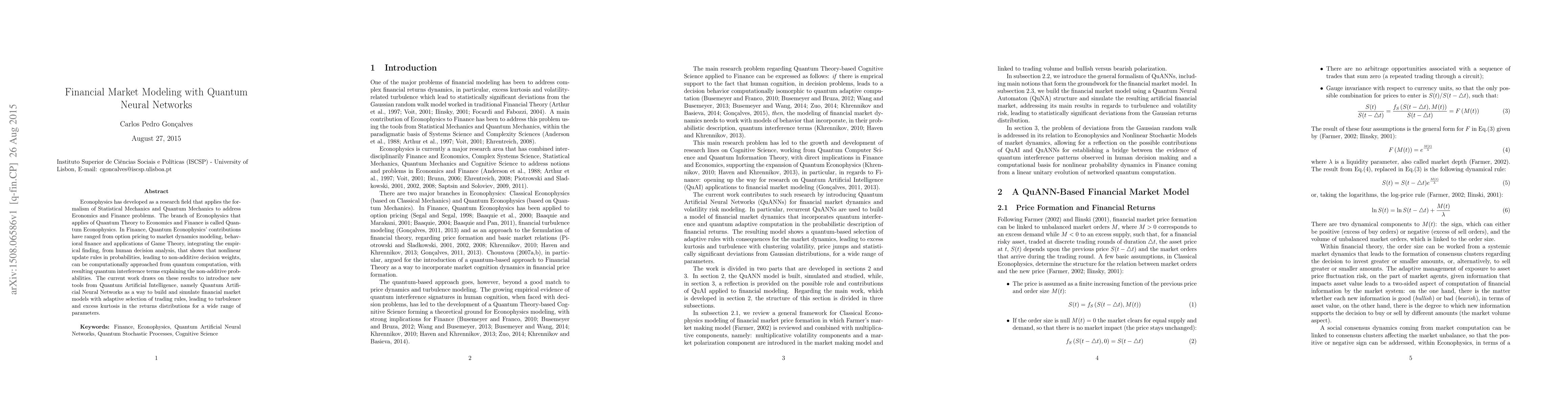 Econophysics has developed as a research field that applies the formalism of Statistical Mechanics and Quantum Mechanics to address Economics and Finance problems. The branch of Econophysics that applies of Quantum Theory to Economics and Finance is called Quantum Econophysics. In Finance, Quantum Econophysics' contributions have ranged from option pricing to market dynamics modeling, behavioral finance and applications of Game Theory, integrating the empirical finding, from human decision analysis, that shows that nonlinear update rules in probabilities, leading to non-additive decision weights, can be computationally approached from quantum computation, with resulting quantum interference terms explaining the non-additive probabilities. The current work draws on these results to introduce new tools from Quantum Artificial Intelligence, namely Quantum Artificial Neural Networks as a way to build and simulate financial market models with adaptive selection of trading rules, leading to turbulence and excess kurtosis in the returns distributions for a wide range of parameters.
