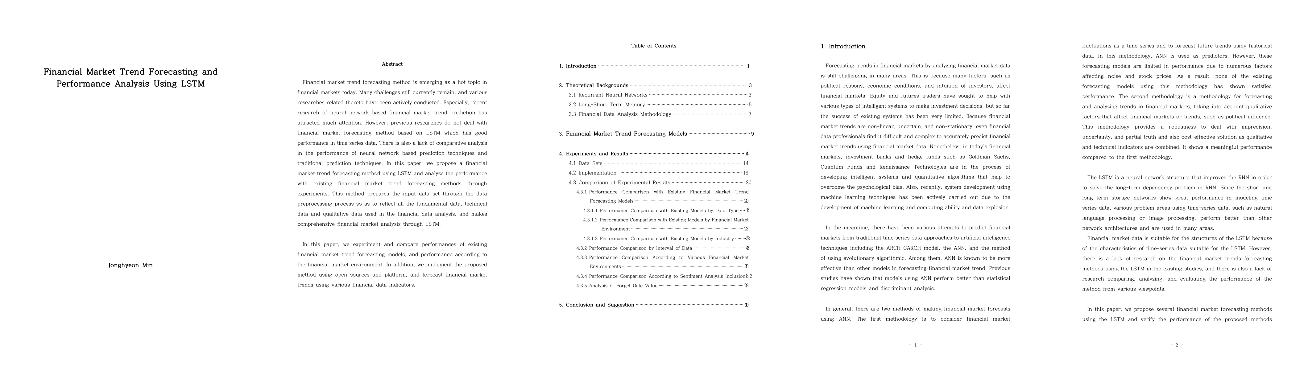 The financial market trend forecasting method is emerging as a hot topic in financial markets today. Many challenges still currently remain, and various researches related thereto have been actively conducted. Especially, recent research of neural network-based financial market trend prediction has attracted much attention. However, previous researches do not deal with the financial market forecasting method based on LSTM which has good performance in time series data. There is also a lack of comparative analysis in the performance of neural network-based prediction techniques and traditional prediction techniques. In this paper, we propose a financial market trend forecasting method using LSTM and analyze the performance with existing financial market trend forecasting methods through experiments. This method prepares the input data set through the data preprocessing process so as to reflect all the fundamental data, technical data and qualitative data used in the financial data analysis, and makes comprehensive financial market analysis through LSTM. In this paper, we experiment and compare performances of existing financial market trend forecasting models, and performance according to the financial market environment. In addition, we implement the proposed method using open sources and platform and forecast financial market trends using various financial data indicators.