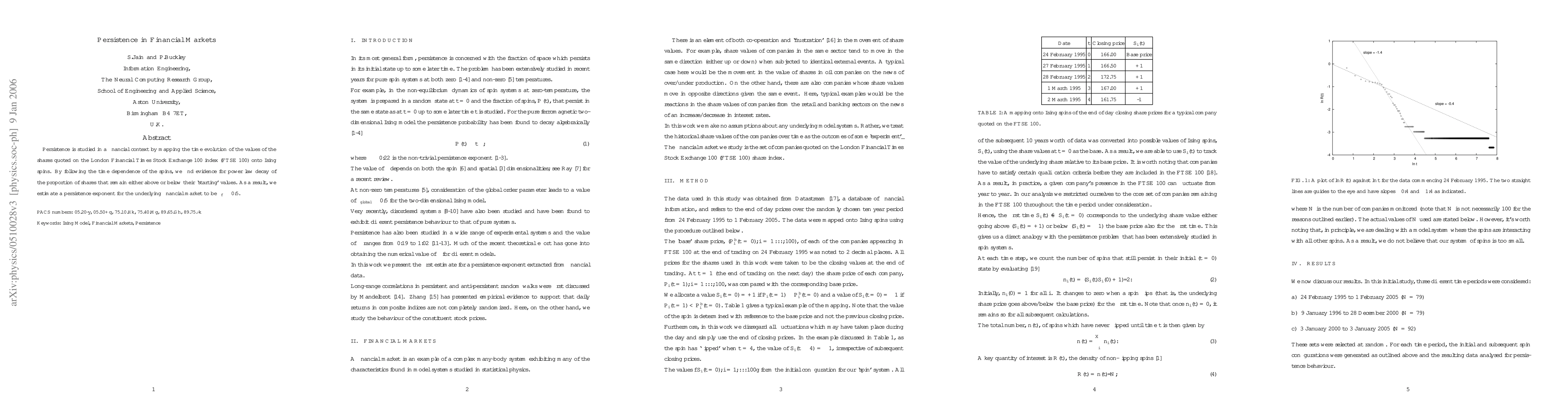 Persistence is studied in a financial context by mapping the time evolution of the values of the shares quoted on the London Financial Times Stock Exchange 100 index (FTSE 100) onto Ising spins. By following the time dependence of the spins, we find evidence for power law decay of the proportion of shares that remain either above or below their ` starting\rq values. As a result, we estimate a persistence exponent for the underlying financial market to be $\theta_f\sim 0.5$.