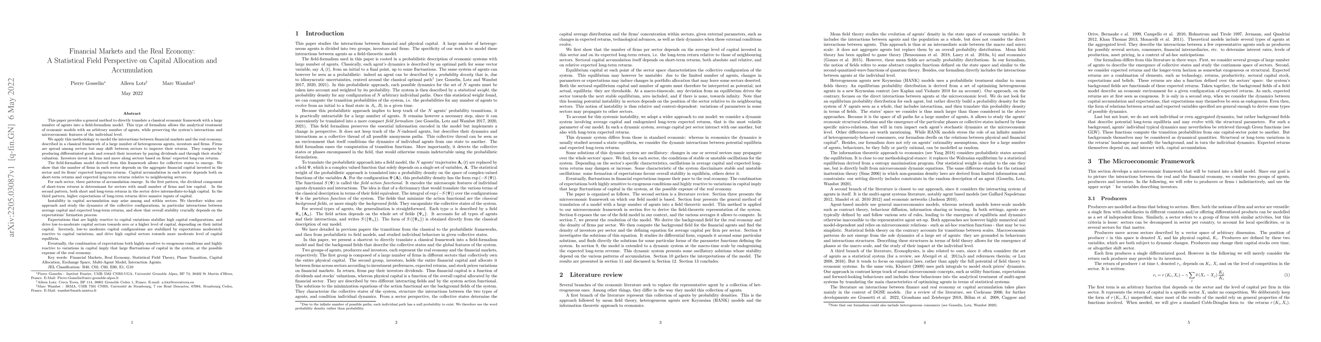 This paper provides a general method to directly translate a classical economic framework with a large number of agents into a field-formalism model. This type of formalism allows the analytical treatment of economic models with an arbitrary number of agents, while preserving the system's interactions and microeconomic features of the individual level.We apply this methodology to model the interactions between financial markets and the real economy, described in a classical framework of a large number of heterogeneous agents, investors and firms. Firms are spread among sectors but may shift between sectors to improve their returns. They compete by producing differentiated goods and reward their investors by paying dividends and through their stocks' valuation. Investors invest in firms and move along sectors based on firms' expected long-run returns.The field-formalism model derived from this framework allows for collective states to emerge. We show that the number of firms in each sector depends on the aggregate financial capital invested in the sector and its firms' expected long-term returns. Capital accumulation in each sector depends both on short-term returns and expected long-term returns relative to neighbouring sectors.For each sector, three patterns of accumulation emerge. In the first pattern, the dividend component of short-term returns is determinant for sectors with small number of firms and low capital. In the second pattern, both short and long-term returns in the sector drive intermediate-to-high capital. In the third pattern, higher expectations of long-term returns drive massive inputs of capital.Instability in capital accumulation may arise among and within sectors. We therefore widen our approach and study the dynamics of the collective configurations, in particular interactions between average capital and expected long-term returns, and show that overall stability crucially depends on the expectations' formation process.Expectations that are highly reactive to capital variations stabilize high capital configurations, and drive low-to-moderate capital sectors towards zero or a higher level of capital, depending on their initial capital. Inversely, low-to moderate capital configurations are stabilized by expectations moderately reactive to capital variations, and drive high capital sectors towards more moderate level of capital equilibria.Eventually, the combination of expectations both highly sensitive to exogenous conditions and highly reactive to variations in capital imply that large fluctuations of capital in the system, at the possible expense of the real economy.