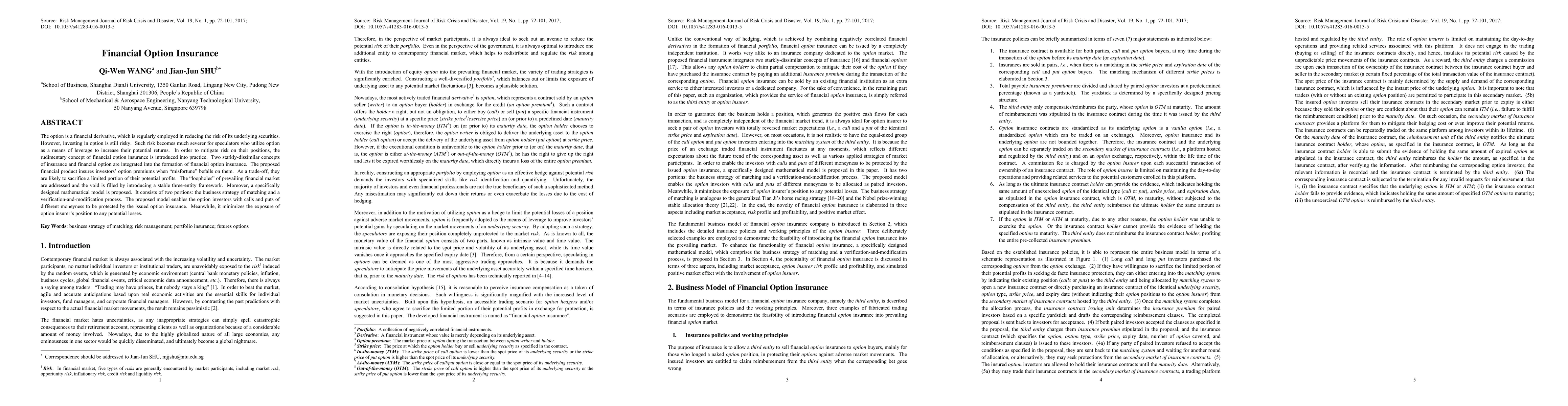The option is a financial derivative, which is regularly employed in reducing the risk of its underlying securities. However, investing in option is still risky. Such risk becomes much severer for speculators who utilize option as a means of leverage to increase their potential returns. In order to mitigate risk on their positions, the rudimentary concept of financial option insurance is introduced into practice. Two starkly-dissimilar concepts of insurance and financial option are integrated into the formation of financial option insurance. The proposed financial product insures investors option premiums when misfortune befalls on them. As a trade-off, they are likely to sacrifice a limited portion of their potential profits. The loopholes of prevailing financial market are addressed and the void is filled by introducing a stable three-entity framework. Moreover, a specifically designed mathematical model is proposed. It consists of two portions: the business strategy of matching and a verification-and-modification process. The proposed model enables the option investors with calls and puts of different moneyness to be protected by the issued option insurance. Meanwhile, it minimizes the exposure of option insurers position to any potential losses.