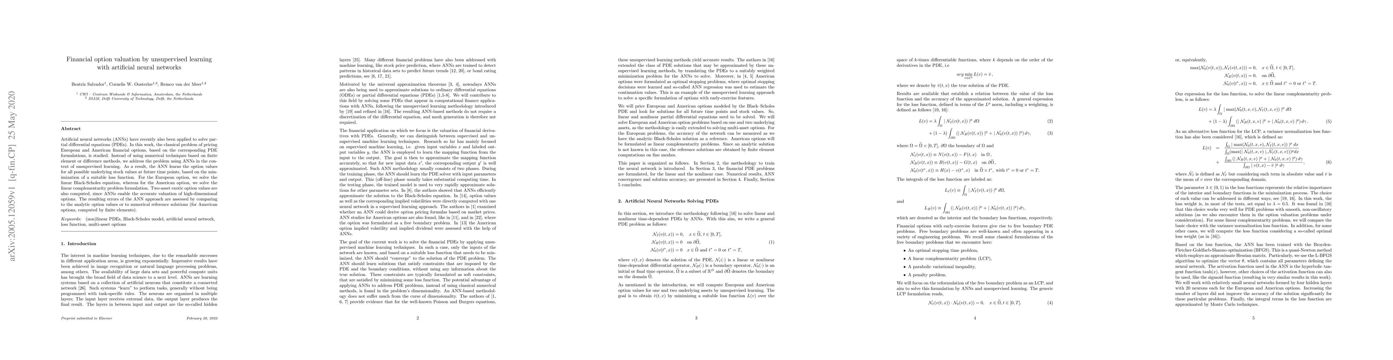 Artificial neural networks (ANNs) have recently also been applied to solve partial differential equations (PDEs). In this work, the classical problem of pricing European and American financial options, based on the corresponding PDE formulations, is studied. Instead of using numerical techniques based on finite element or difference methods, we address the problem using ANNs in the context of unsupervised learning. As a result, the ANN learns the option values for all possible underlying stock values at future time points, based on the minimization of a suitable loss function. For the European option, we solve the linear Black-Scholes equation, whereas for the American option, we solve the linear complementarity problem formulation. Two-asset exotic option values are also computed, since ANNs enable the accurate valuation of high-dimensional options. The resulting errors of the ANN approach are assessed by comparing to the analytic option values or to numerical reference solutions (for American options, computed by finite elements).