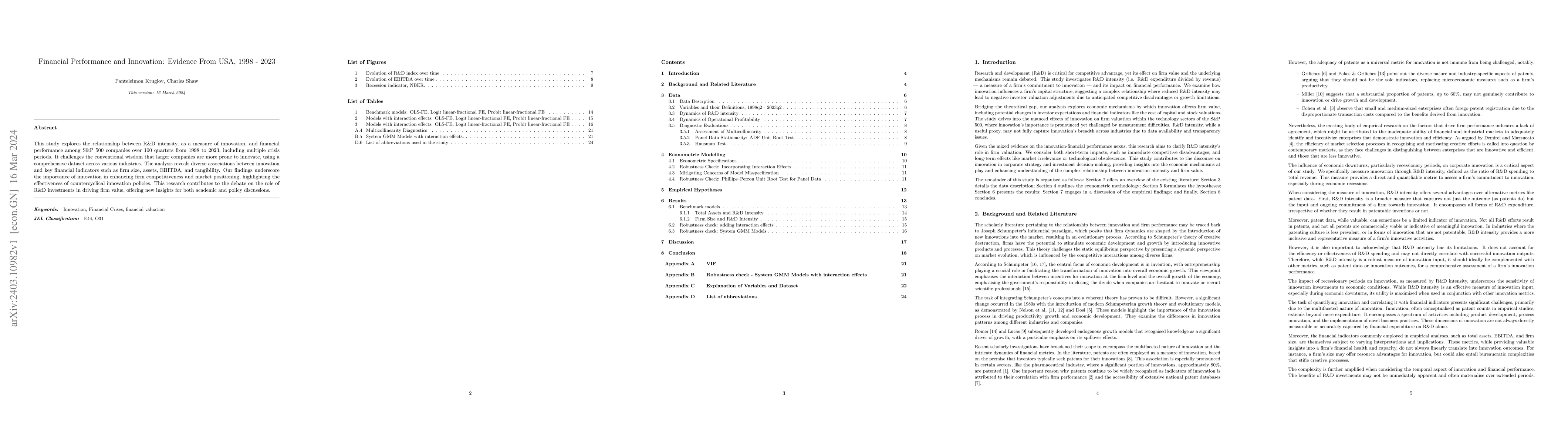 This study investigates the link between R&D intensity and financial performance for S&P 500 companies from 1998 to 2023, revealing varied associations between innovation and financial metrics. It highlights the significance of innovation in firm competitiveness and supports countercyclical innovation policies.