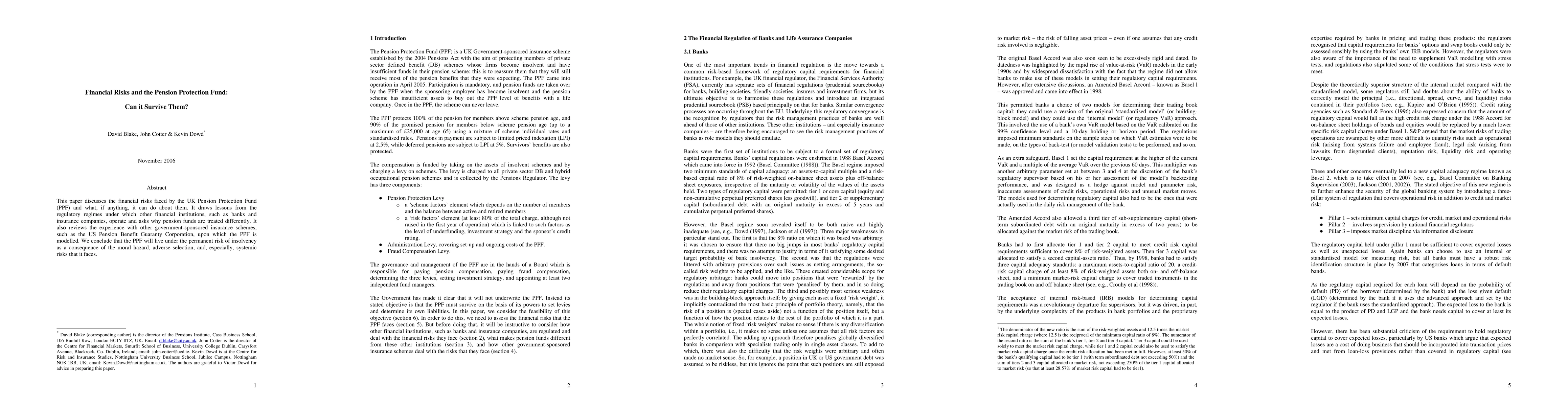 This paper discusses the financial risks faced by the UK Pension Protection Fund (PPF) and what, if anything, it can do about them. It draws lessons from the regulatory regimes under which other financial institutions, such as banks and insurance companies, operate and asks why pension funds are treated differently. It also reviews the experience with other government-sponsored insurance schemes, such as the US Pension Benefit Guaranty Corporation, upon which the PPF is modelled. We conclude that the PPF will live under the permanent risk of insolvency as a consequence of the moral hazard, adverse selection, and, especially, systemic risks that it faces.