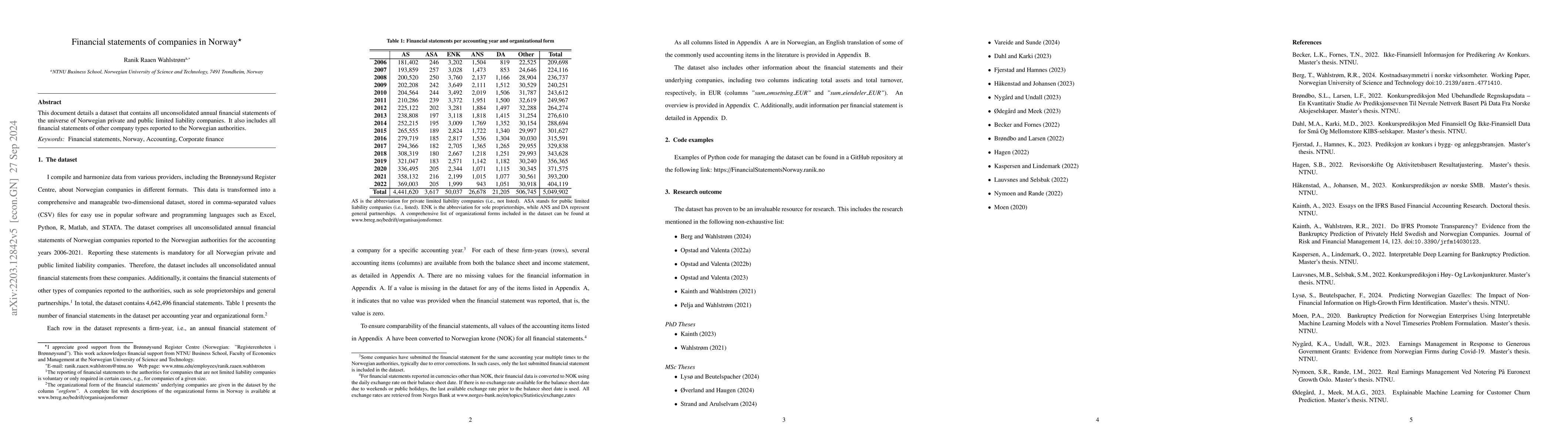 Summary: This paper presents a comprehensive dataset of unconsolidated annual financial statements for all Norwegian private and public limited liability companies, along with financial statements from other company types reported to Norwegian authorities. The dataset serves as a valuable resource for financial analysis and research.