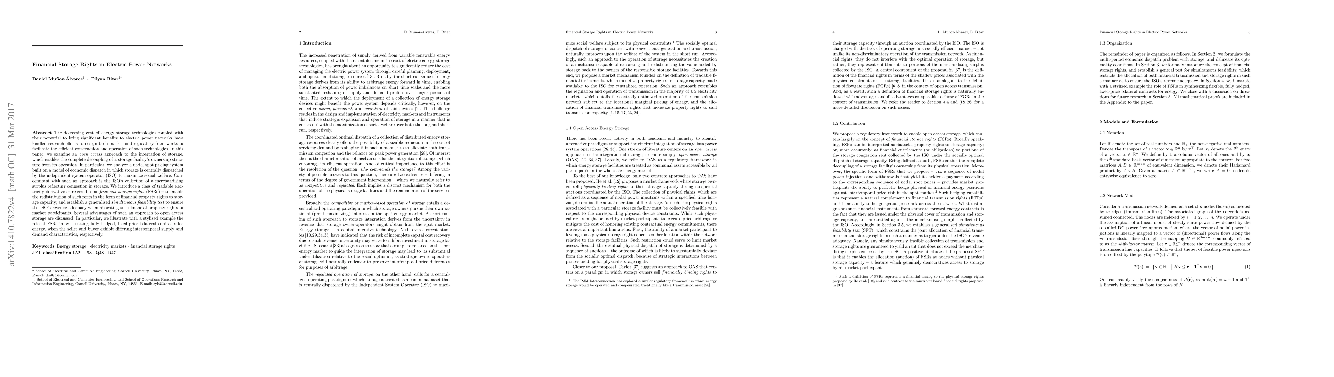 This paper explores an open access framework for integrating energy storage in electric power networks, proposing financial storage rights (FSRs) to redistribute congestion rents. It introduces a nodal spot pricing system where the ISO centrally dispatches storage to maximize social welfare, and uses FSRs to enable fully hedged, fixed-price bilateral contracts for energy, addressing differing intertemporal supply and demand characteristics.