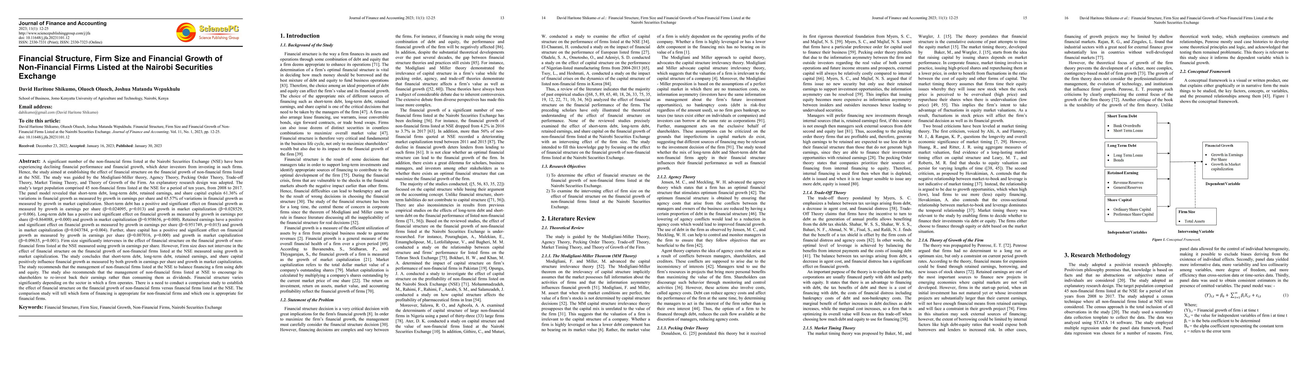 Summary: This study investigates the relationship between financial structure and financial growth among non-financial firms listed on the Nairobi Securities Exchange, aiming to identify factors that could improve declining financial performance and attract investor confidence. The findings are expected to provide insights into optimizing financial strategies for these firms.