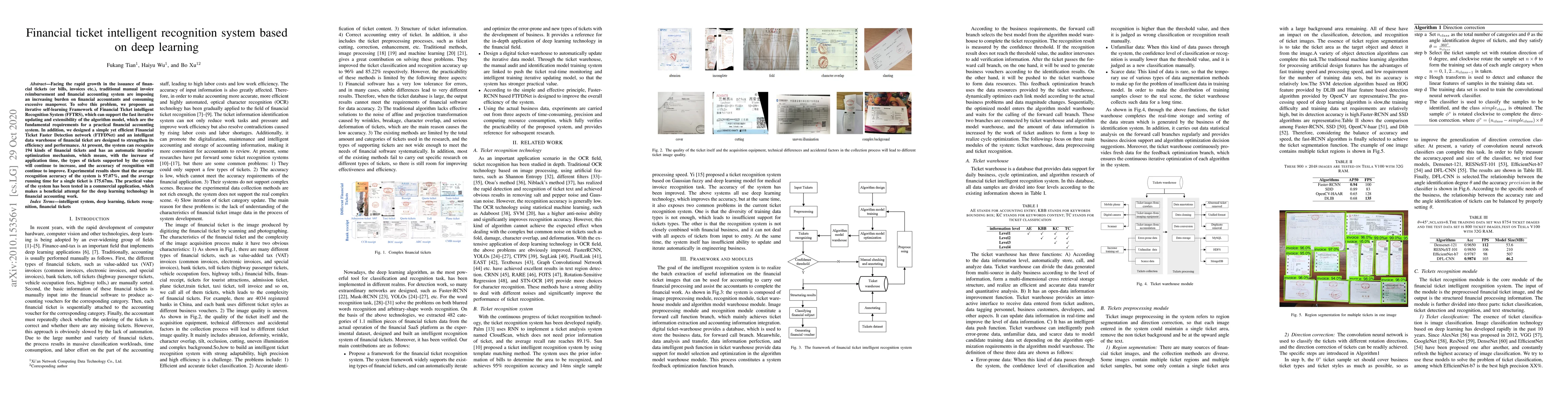 Facing the rapid growth in the issuance of financial tickets (or bills, invoices etc.), traditional manual invoice reimbursement and financial accounting system are imposing an increasing burden on financial accountants and consuming excessive manpower. To solve this problem, we proposes an iterative self-learning Framework of Financial Ticket intelligent Recognition System (FFTRS), which can support the fast iterative updating and extensibility of the algorithm model, which are the fundamental requirements for a practical financial accounting system. In addition, we designed a simple yet efficient Financial Ticket Faster Detection network (FTFDNet) and an intelligent data warehouse of financial ticket are designed to strengthen its efficiency and performance. At present, the system can recognize 194 kinds of financial tickets and has an automatic iterative optimization mechanism, which means, with the increase of application time, the types of tickets supported by the system will continue to increase, and the accuracy of recognition will continue to improve. Experimental results show that the average recognition accuracy of the system is 97.07%, and the average running time for a single ticket is 175.67ms. The practical value of the system has been tested in a commercial application, which makes a beneficial attempt for the deep learning technology in financial accounting work.