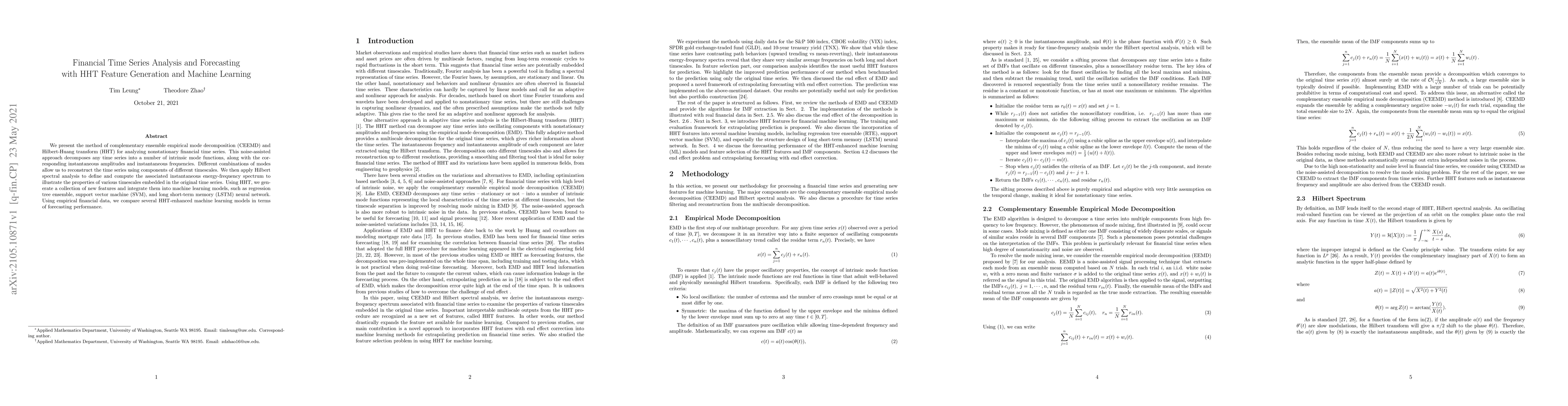 This paper proposes using complementary ensemble empirical mode decomposition (CEEMD) and Hilbert-Huang transform (HHT) to analyze and forecast nonstationary financial time series. It generates new features from decomposed intrinsic mode functions and evaluates their performance in machine learning models for forecasting.