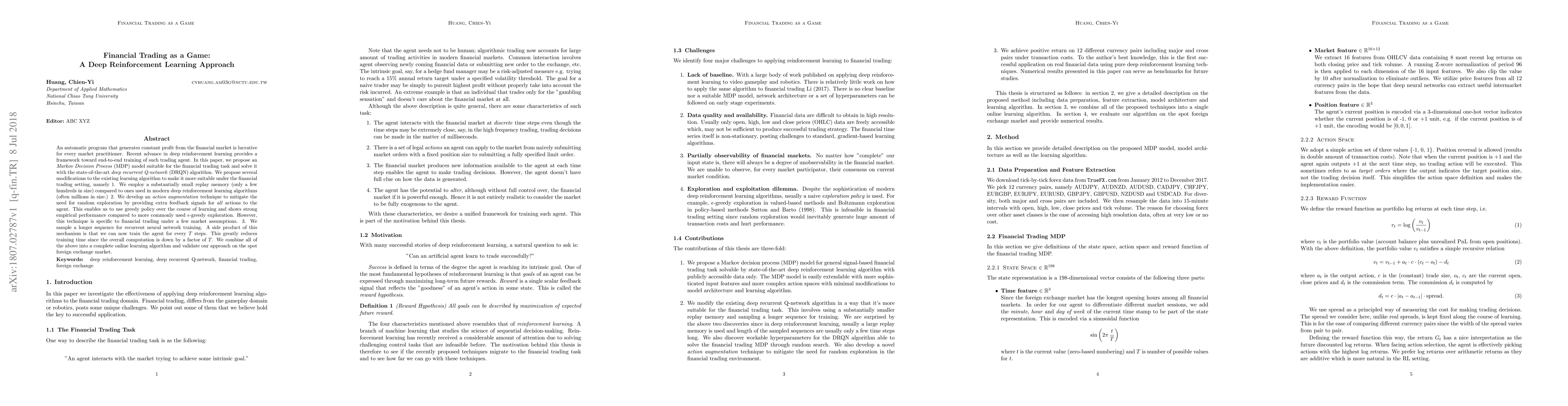 This paper proposes a deep reinforcement learning approach for financial trading using a modified Markov Decision Process model and a deep recurrent Q-network algorithm. Key modifications include a small replay memory, action augmentation for feedback, and longer sequence sampling for recurrent neural networks, which significantly reduce training time and improve performance.