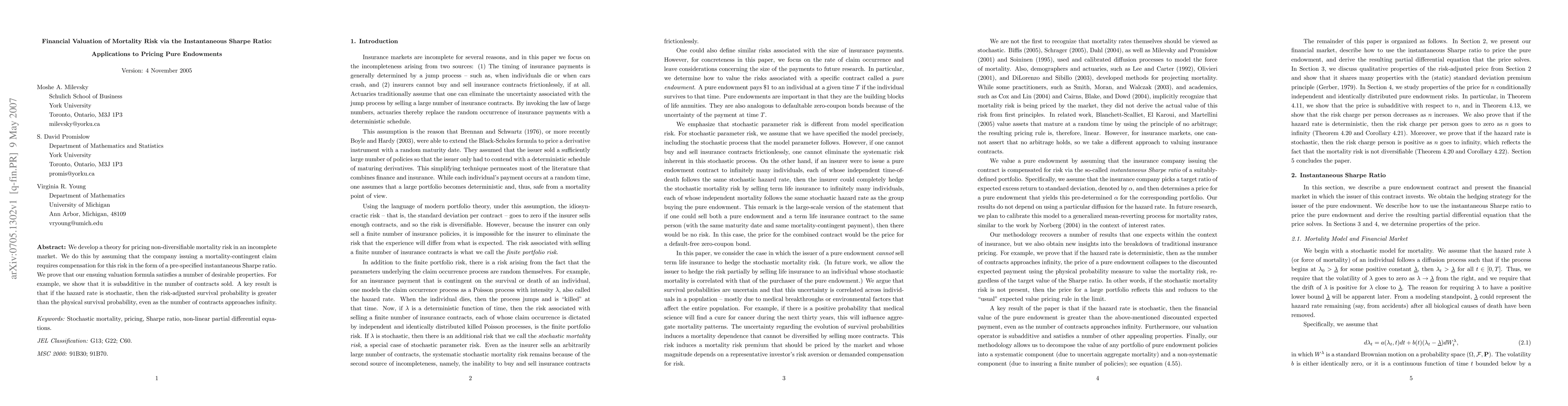 We develop a theory for pricing non-diversifiable mortality risk in an incomplete market. We do this by assuming that the company issuing a mortality-contingent claim requires compensation for this risk in the form of a pre-specified instantaneous Sharpe ratio. We prove that our ensuing valuation formula satisfies a number of desirable properties. For example, we show that it is subadditive in the number of contracts sold. A key result is that if the hazard rate is stochastic, then the risk-adjusted survival probability is greater than the physical survival probability, even as the number of contracts approaches infinity.