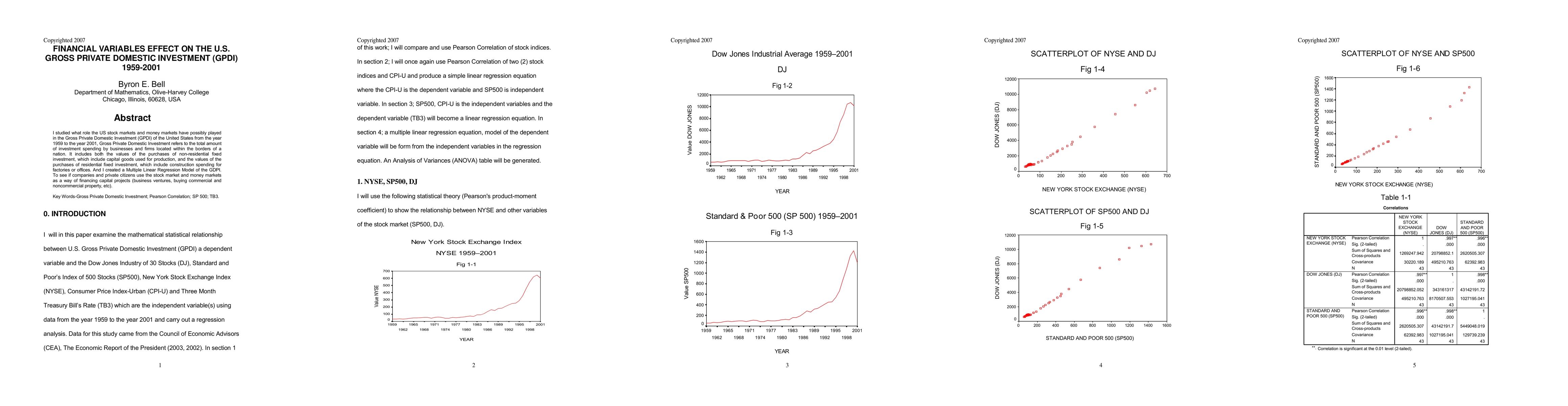 I studied what role the US stock markets and money markets have possibly played in the Gross Private Domestic Investment (GPDI) of the United States from the year 1959 to the year 2001, Gross Private Domestic Investment refers to the total amount of investment spending by businesses and firms located within the borders of a nation. It includes both the values of the purchases of non-residential fixed investment, which include capital goods used for production, and the values of the purchases of residential fixed investment, which include construction spending for factories or offices. And I created a Multiple Linear Regression Model of the GDPI. To see if companies and private citizens use the stock market and money markets as a way of financing capital projects (business ventures, buying commercial and noncommercial property, etc). Keywords: Gross Private Domestic Investment, Pearson Correlation, SP 500, TB3