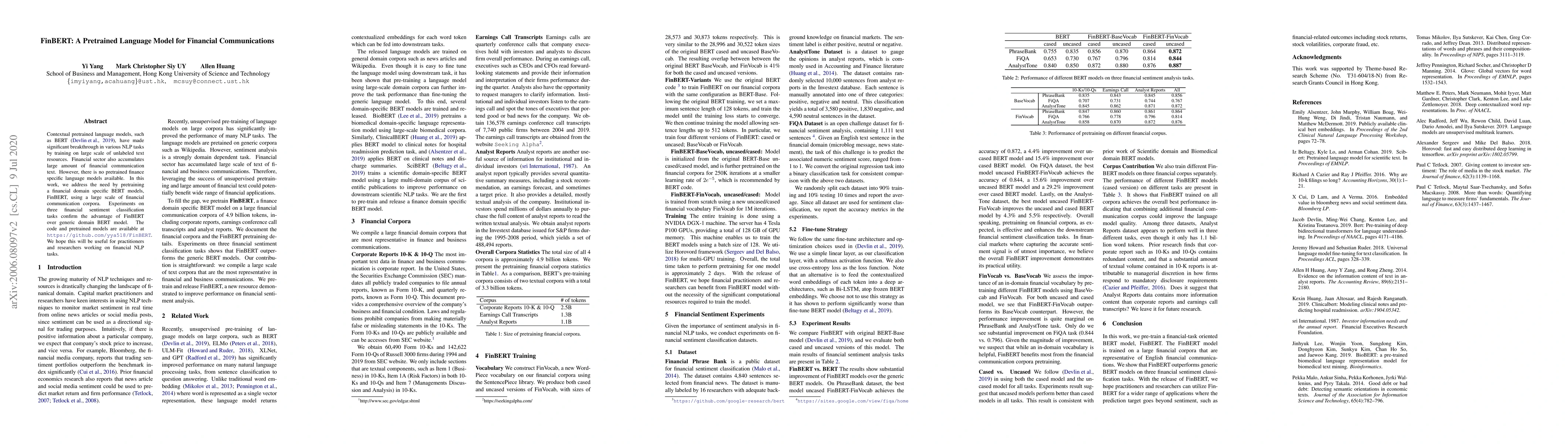 FinBERT is a pretrained language model specifically designed for financial communications, addressing the lack of finance-specific models. Experiments show it outperforms generic BERT models in financial sentiment classification tasks, with code and pretrained models available for further research.