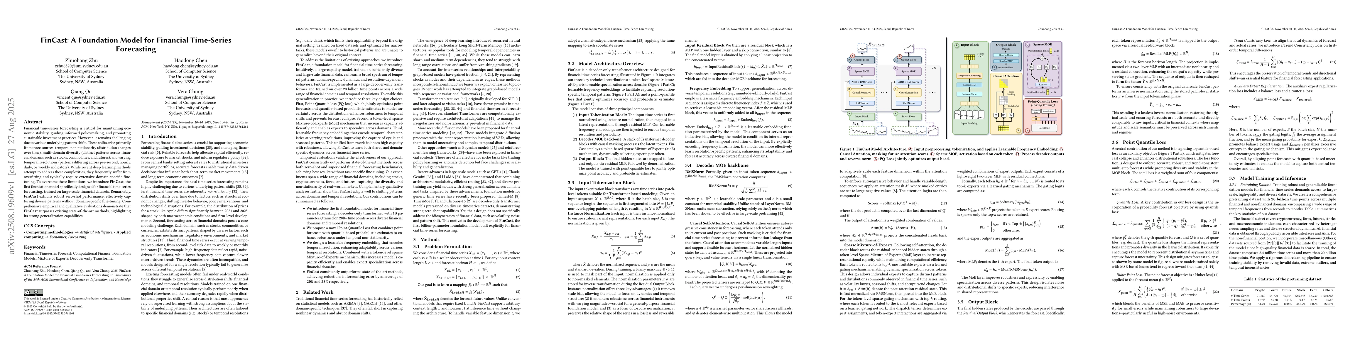 Financial time-series forecasting is critical for maintaining economic stability, guiding informed policymaking, and promoting sustainable investment practices. However, it remains challenging due to various underlying pattern shifts. These shifts arise primarily from three sources: temporal non-stationarity (distribution changes over time), multi-domain diversity (distinct patterns across financial domains such as stocks, commodities, and futures), and varying temporal resolutions (patterns differing across per-second, hourly, daily, or weekly indicators). While recent deep learning methods attempt to address these complexities, they frequently suffer from overfitting and typically require extensive domain-specific fine-tuning. To overcome these limitations, we introduce FinCast, the first foundation model specifically designed for financial time-series forecasting, trained on large-scale financial datasets. Remarkably, FinCast exhibits robust zero-shot performance, effectively capturing diverse patterns without domain-specific fine-tuning. Comprehensive empirical and qualitative evaluations demonstrate that FinCast surpasses existing state-of-the-art methods, highlighting its strong generalization capabilities.