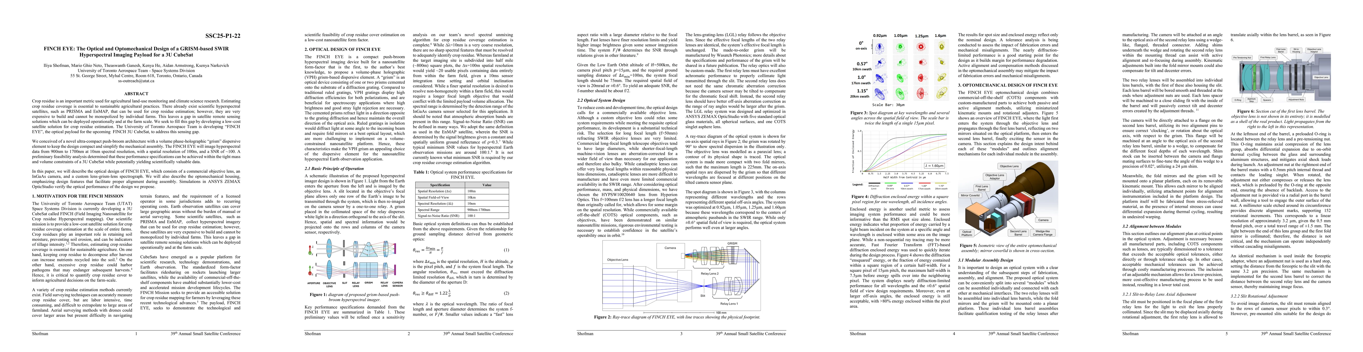 Crop residue is an important metric used for agricultural land-use monitoring and climate science research. Estimating crop residue coverage is essential to sustainable agricultural practices. The University of Toronto Aerospace Team is developing FINCH EYE, the optical payload for the upcoming FINCH 3U CubeSat, to measure crop residue cover. We conceived of a novel ultra-compact push-broom architecture with a volume phase-holographic grism dispersive element to keep the design compact and simplify the mechanical assembly. The FINCH EYE will image hyperspectral data from 900nm to 1700nm at 10nm spectral resolution, with a spatial resolution of 100m, and a SNR of 100. In this paper, we will describe the optical design of FINCH EYE, which consists of a commercial objective lens, an InGaAs camera, and a custom lens-grism-lens spectrograph. We will also describe the optomechanical housing, emphasizing design features that facilitate proper alignment during assembly.