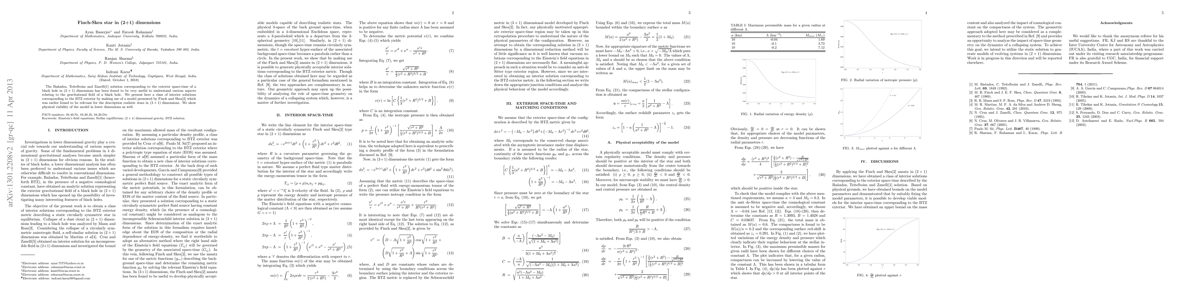 The Ba\~{n}ados, Teitelboim and Zanelli\cite{BTZ} solution corresponding to the exterior space-time of a black hole in $(2+1)$ dimensions has been found to be very useful to understand various aspects relating to the gravitational field of a black hole. We present here a class of interior solutions corresponding to the BTZ exterior by making use of a model presented by Finch and Skea\cite{Finch} which was earlier found to be relevant for the description realistic stars in $(3+1)$ dimensions. We show physical viability of the model in lower dimensions as well.