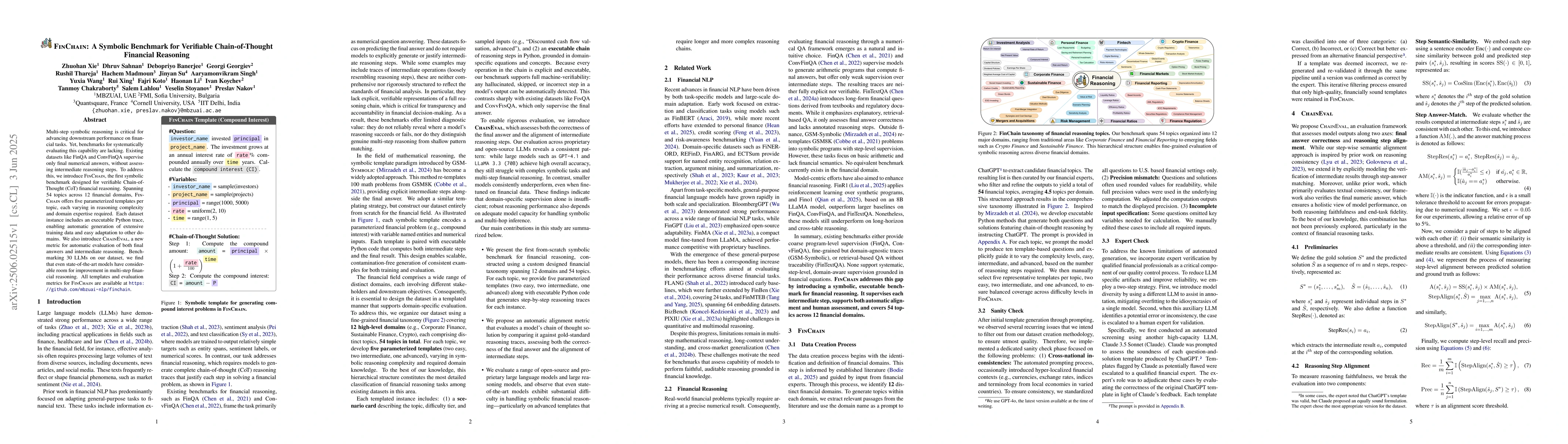 FinChain is the first symbolic benchmark designed for verifiable Chain-of-Thought financial reasoning, introducing ChainEval for automatic evaluation of intermediate reasoning steps.