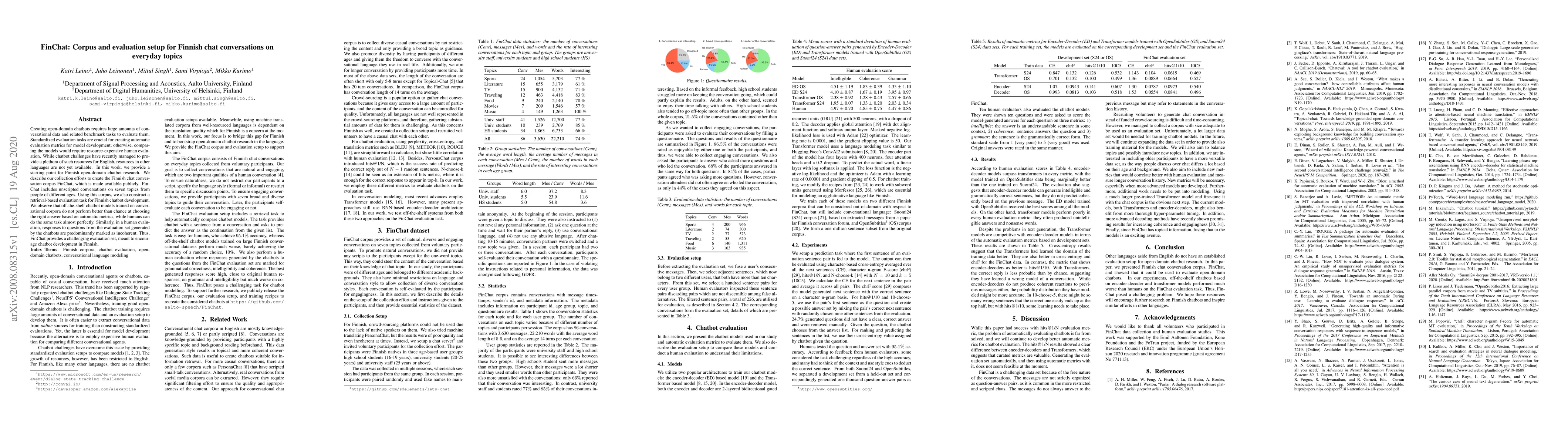 Creating open-domain chatbots requires large amounts of conversational data and related benchmark tasks to evaluate them. Standardized evaluation tasks are crucial for creating automatic evaluation metrics for model development; otherwise, comparing the models would require resource-expensive human evaluation. While chatbot challenges have recently managed to provide a plethora of such resources for English, resources in other languages are not yet available. In this work, we provide a starting point for Finnish open-domain chatbot research. We describe our collection efforts to create the Finnish chat conversation corpus FinChat, which is made available publicly. FinChat includes unscripted conversations on seven topics from people of different ages. Using this corpus, we also construct a retrieval-based evaluation task for Finnish chatbot development. We observe that off-the-shelf chatbot models trained on conversational corpora do not perform better than chance at choosing the right answer based on automatic metrics, while humans can do the same task almost perfectly. Similarly, in a human evaluation, responses to questions from the evaluation set generated by the chatbots are predominantly marked as incoherent. Thus, FinChat provides a challenging evaluation set, meant to encourage chatbot development in Finnish.