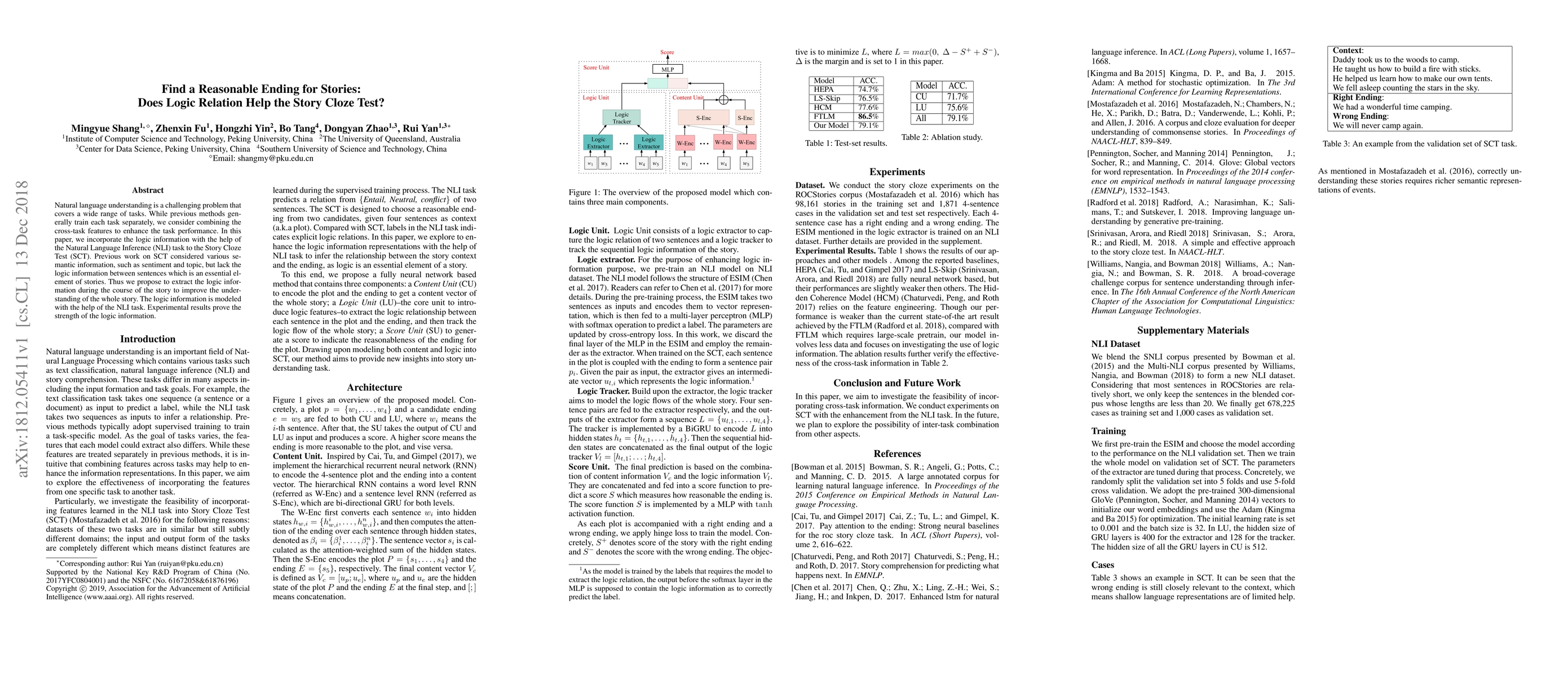 This paper explores integrating logic information from Natural Language Inference (NLI) into the Story Cloze Test (SCT) to enhance story understanding. By incorporating logic relations between sentences, the study demonstrates improved performance in comprehending the overall narrative.