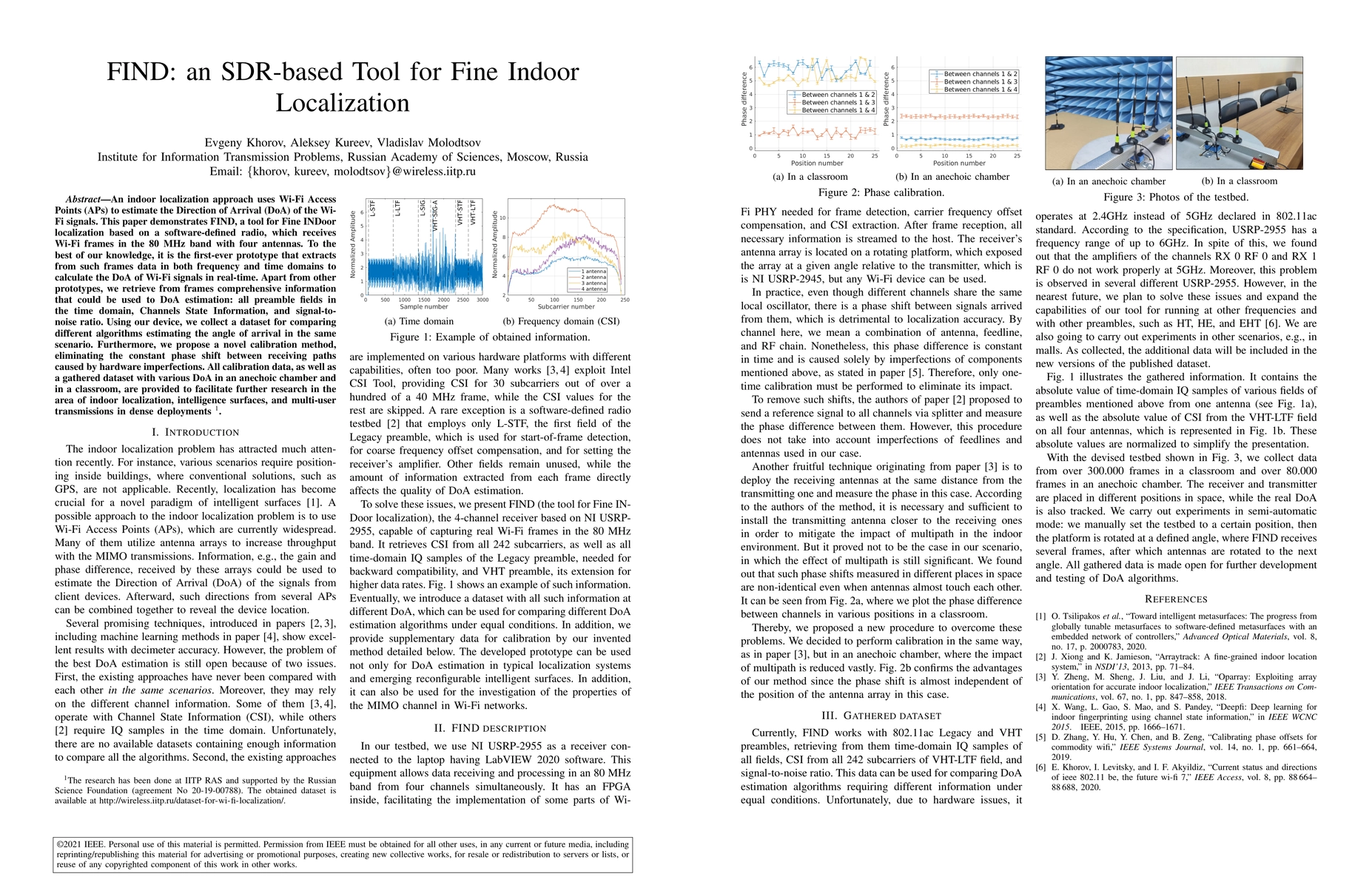 An indoor localization approach uses Wi-Fi Access Points (APs) to estimate the Direction of Arrival (DoA) of the WiFi signals. This paper demonstrates FIND, a tool for Fine INDoor localization based on a software-defined radio, which receives Wi-Fi frames in the 80 MHz band with four antennas. To the best of our knowledge, it is the first-ever prototype that extracts from such frames data in both frequency and time domains to calculate the DoA of Wi-Fi signals in real-time. Apart from other prototypes, we retrieve from frames comprehensive information that could be used to DoA estimation: all preamble fields in the time domain, Channels State Information, and signal-to-noise ratio. Using our device, we collect a dataset for comparing different algorithms estimating the angle of arrival in the same scenario. Furthermore, we propose a novel calibration method, eliminating the constant phase shift between receiving paths caused by hardware imperfections. All calibration data, as well as a gathered dataset with various DoA in an anechoic chamber and in a classroom, are provided to facilitate further research in the area of indoor localization, intelligence surfaces, and multi-user transmissions in dense deployments.