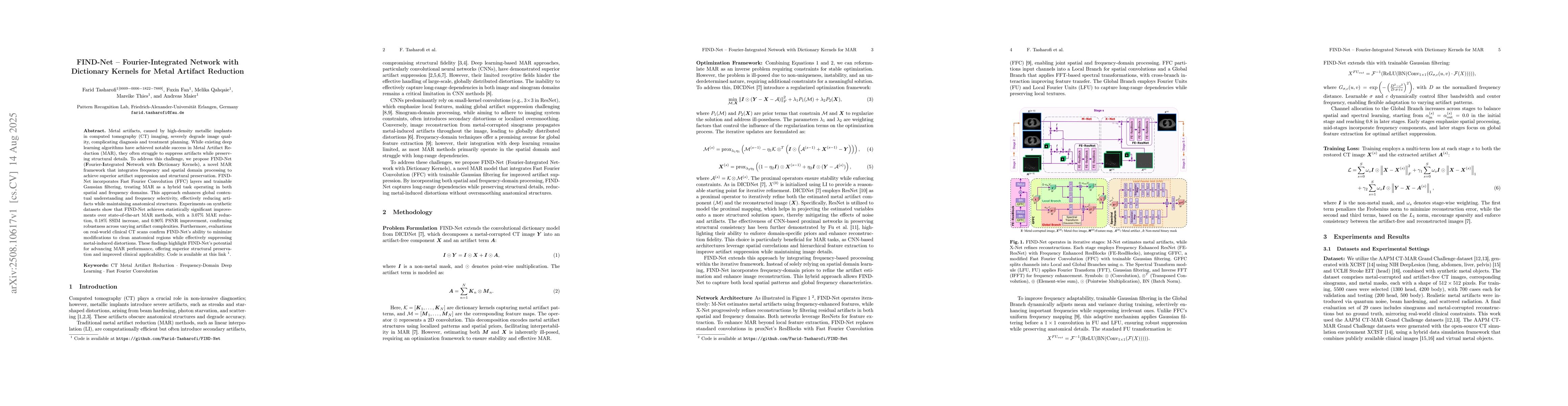 Metal artifacts, caused by high-density metallic implants in computed tomography (CT) imaging, severely degrade image quality, complicating diagnosis and treatment planning. While existing deep learning algorithms have achieved notable success in Metal Artifact Reduction (MAR), they often struggle to suppress artifacts while preserving structural details. To address this challenge, we propose FIND-Net (Fourier-Integrated Network with Dictionary Kernels), a novel MAR framework that integrates frequency and spatial domain processing to achieve superior artifact suppression and structural preservation. FIND-Net incorporates Fast Fourier Convolution (FFC) layers and trainable Gaussian filtering, treating MAR as a hybrid task operating in both spatial and frequency domains. This approach enhances global contextual understanding and frequency selectivity, effectively reducing artifacts while maintaining anatomical structures. Experiments on synthetic datasets show that FIND-Net achieves statistically significant improvements over state-of-the-art MAR methods, with a 3.07% MAE reduction, 0.18% SSIM increase, and 0.90% PSNR improvement, confirming robustness across varying artifact complexities. Furthermore, evaluations on real-world clinical CT scans confirm FIND-Net's ability to minimize modifications to clean anatomical regions while effectively suppressing metal-induced distortions. These findings highlight FIND-Net's potential for advancing MAR performance, offering superior structural preservation and improved clinical applicability. Code is available at https://github.com/Farid-Tasharofi/FIND-Net