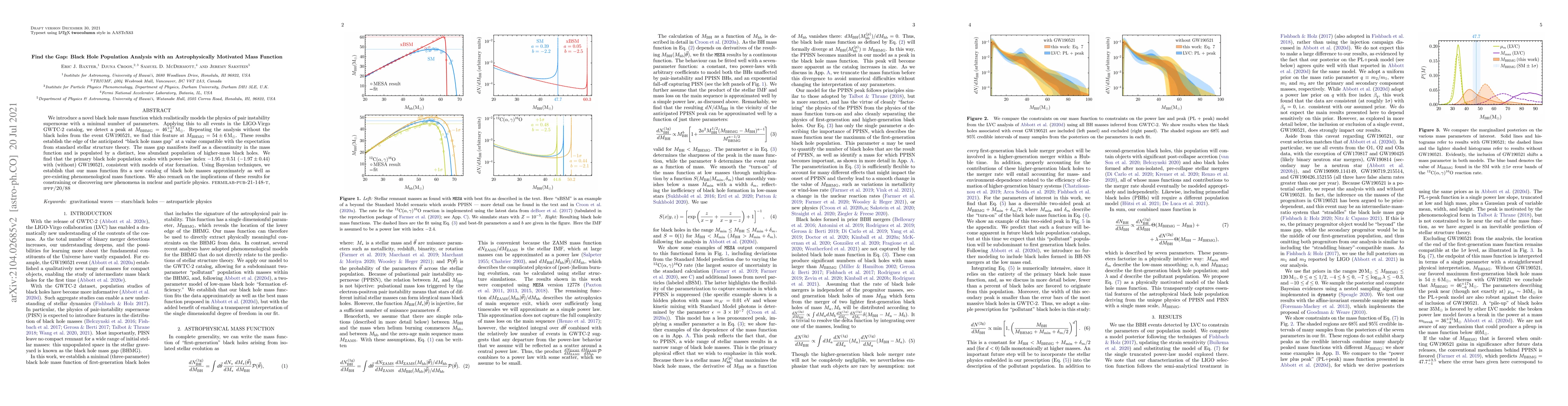 We introduce a novel black hole mass function which realistically models the physics of star formation and pair instability supernova with a minimal number of parameters. Applying this to all events in the LIGO-Virgo GWTC-2 catalog, we detect a peak at M_BHMG = 74.8^{+4.3}_{-8.0} MS, followed by a break in the mass function. Repeating the analysis without the black holes from the event GW190521, we find this feature at M_BHMG = 55.4^{+3.0}_{-6.1} MS. The latter result establishes the edge of the anticipated "black hole mass gap" at a value compatible with the expectation from standard stellar structure theory, while the former result is ~ 20MS higher, which would have far-reaching implications if confirmed. Using Bayesian techniques, we establish that our mass function fits a new catalog of black hole masses approximately as well as the pre-existing phenomenological mass functions. We also remark on the implications of these results for constraining or discovering new phenomena in nuclear and particle physics.