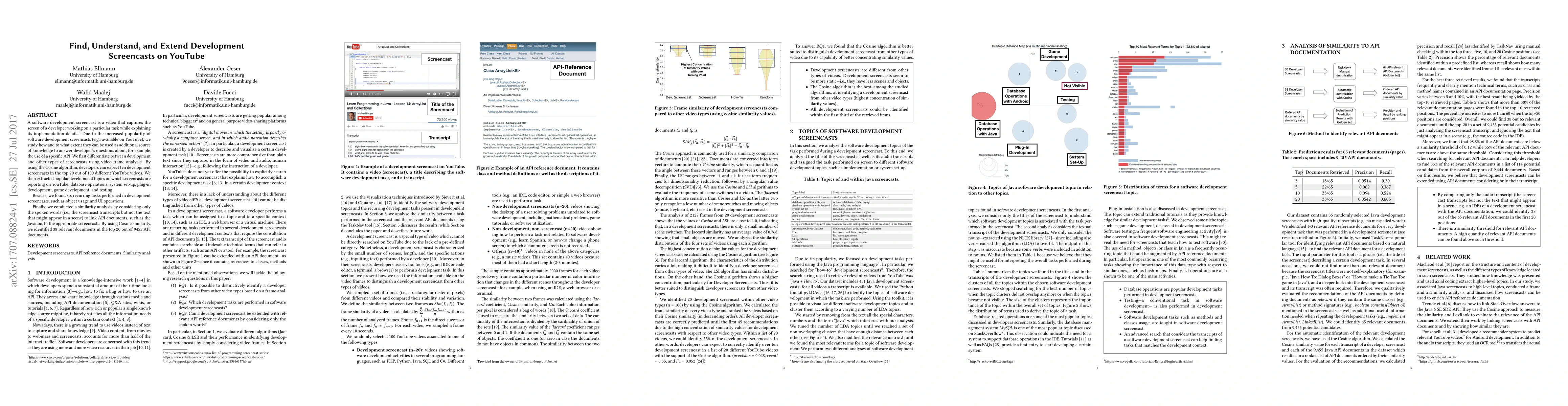 A software development screencast is a video that captures the screen of a developer working on a particular task while explaining its implementation details. Due to the increased popularity of software development screencasts (e.g., available on YouTube), we study how and to what extent they can be used as additional source of knowledge to answer developer's questions about, for example, the use of a specific API. We first differentiate between development and other types of screencasts using video frame analysis. By using the Cosine algorithm, developers can expect ten development screencasts in the top 20 out of 100 different YouTube videos. We then extracted popular development topics on which screencasts are reporting on YouTube: database operations, system set-up, plug-in development, game development, and testing. Besides, we found six recurring tasks performed in development screencasts, such as object usage and UI operations. Finally, we conducted a similarity analysis by considering only the spoken words (i.e., the screencast transcripts but not the text that might appear in a scene) to link API documents, such as the Javadoc, to the appropriate screencasts. By using Cosine similarity, we identified 38 relevant documents in the top 20 out of 9455 API documents.