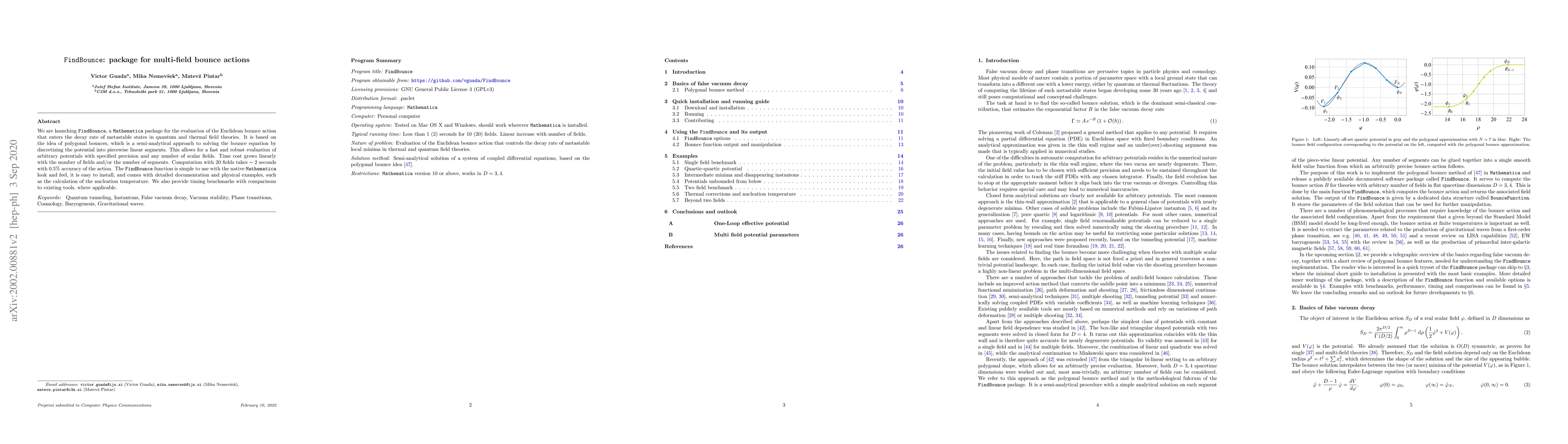 We are launching FindBounce, a Mathematica package for the evaluation of the Euclidean bounce action that enters the decay rate of metastable states in quantum and thermal field theories. It is based on the idea of polygonal bounces, which is a semi-analytical approach to solving the bounce equation by discretizing the potential into piecewise linear segments. This allows for a fast and robust evaluation of arbitrary potentials with specified precision and any number of scalar fields. Time cost grows linearly with the number of fields and/or the number of segments. Computation with 20 fields takes $\sim 2$ seconds with $0.5\%$ accuracy of the action. The FindBounce function is simple to use with the native Mathematica look and feel, it is easy to install, and comes with detailed documentation and physical examples, such as the calculation of the nucleation temperature. We also provide timing benchmarks with comparisons to existing tools, where applicable.