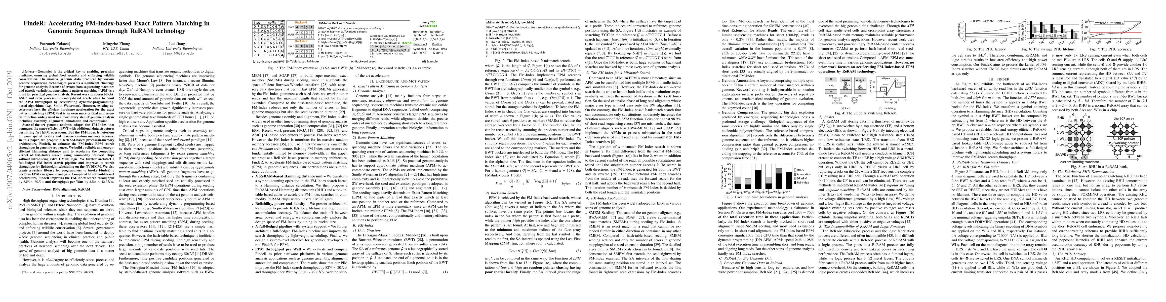 This paper introduces FindeR, a ReRAM-based process-in-memory architecture to accelerate exact pattern matching using the FM-Index in genomic sequences. FindeR enhances throughput and energy efficiency for genome analysis tasks by leveraging commodity ReRAM chips and optimizing memory access patterns.