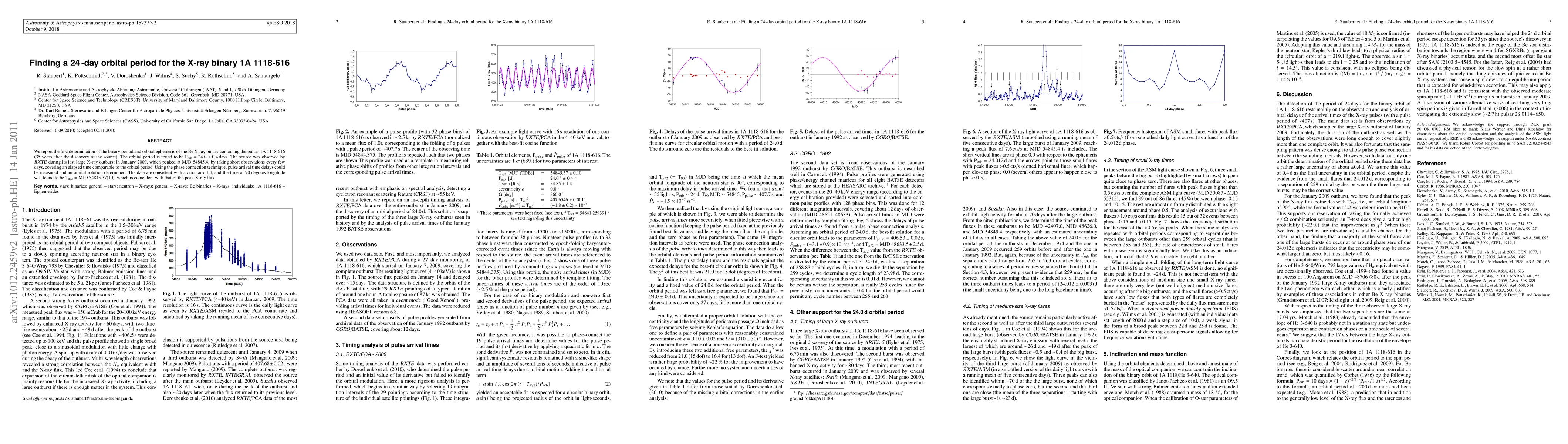 We report the first determination of the binary period and orbital ephemeris of the Be X-ray binary containing the pulsar 1A 1118-616 (35 years after the discovery of the source). The orbital period is found to be Porb = 24.0 +/- 0.4 days. The source was observed by RXTE during its last large X-ray outburst in January 2009, which peaked at MJD 54845.4, by taking short observations every few days, covering an elapsed time comparable to the orbital period. Using the phase connection technique, pulse arrival time delays could be measured and an orbital solution determined. The data are consistent with a circular orbit, and the time of 90 degrees longitude was found to be T90 = MJD 54845.37(10), which is coincident with that of the peak X-ray flux.