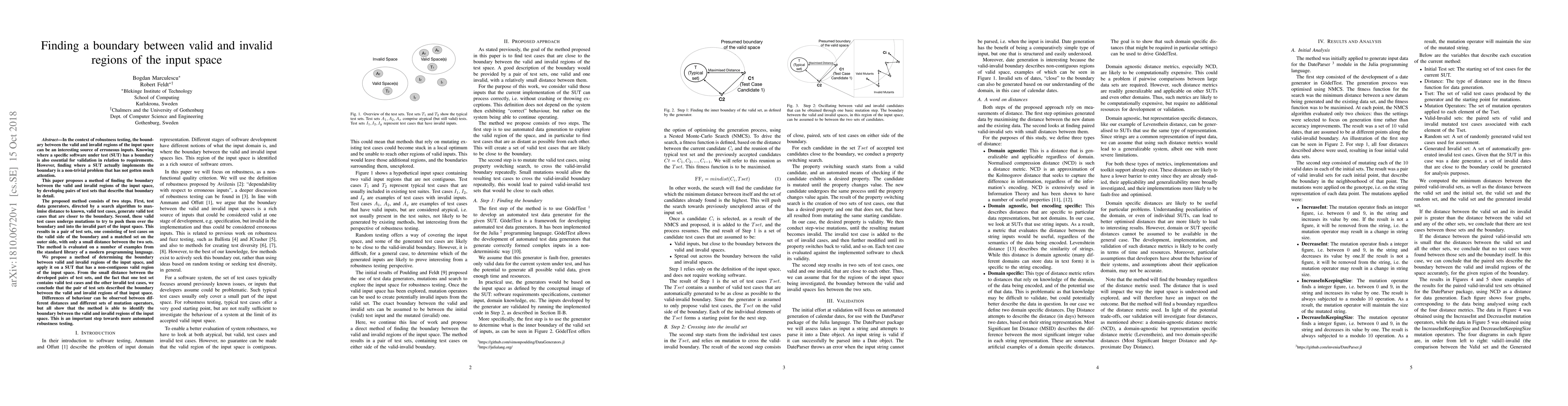 In the context of robustness testing, the boundary between the valid and invalid regions of the input space can be an interesting source of erroneous inputs. Knowing where a specific software under test (SUT) has a boundary is essential for validation in relation to requirements. However, finding where a SUT actually implements the boundary is a non-trivial problem that has not gotten much attention. This paper proposes a method of finding the boundary between the valid and invalid regions of the input space. The proposed method consists of two steps. First, test data generators, directed by a search algorithm to maximise distance to known, valid test cases, generate valid test cases that are closer to the boundary. Second, these valid test cases undergo mutations to try to push them over the boundary and into the invalid part of the input space. This results in a pair of test sets, one consisting of test cases on the valid side of the boundary and a matched set on the outer side, with only a small distance between the two sets. The method is evaluated on a number of examples from the standard library of a modern programming language. We propose a method of determining the boundary between valid and invalid regions of the input space and apply it on a SUT that has a non-contiguous valid region of the input space. From the small distance between the developed pairs of test sets, and the fact that one test set contains valid test cases and the other invalid test cases, we conclude that the pair of test sets described the boundary between the valid and invalid regions of that input space. Differences of behaviour can be observed between different distances and sets of mutation operators, but all show that the method is able to identify the boundary between the valid and invalid regions of the input space. This is an important step towards more automated robustness testing.