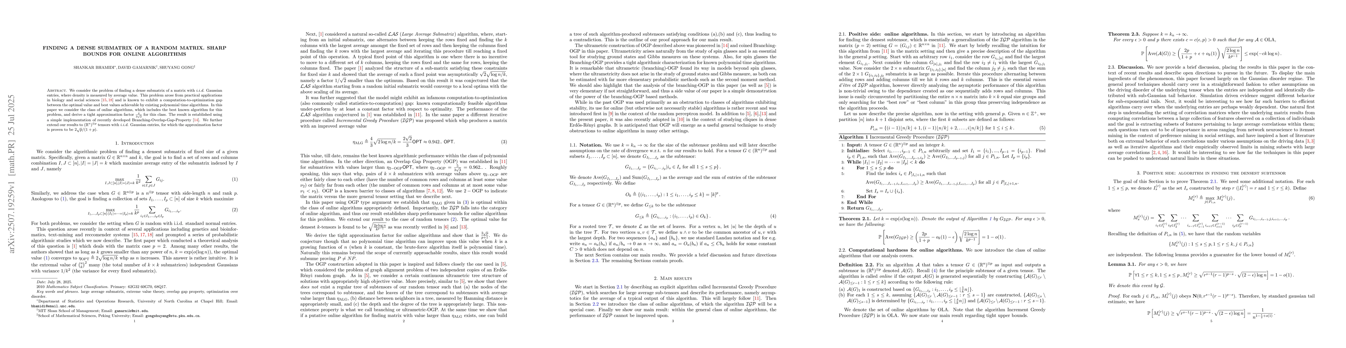 We consider the problem of finding a dense submatrix of a matrix with i.i.d. Gaussian entries, where density is measured by average value. This problem arose from practical applications in biology and social sciences \cites{madeira-survey,shabalin2009finding} and is known to exhibit a computation-to-optimization gap between the optimal value and best values achievable by existing polynomial time algorithms. In this paper we consider the class of online algorithms, which includes the best known algorithm for this problem, and derive a tight approximation factor ${4\over 3\sqrt{2}}$ for this class. The result is established using a simple implementation of recently developed Branching-Overlap-Gap-Property \cite{huang2025tight}. We further extend our results to $(\mathbb R^n)^{\otimes p}$ tensors with i.i.d. Gaussian entries, for which the approximation factor is proven to be ${2\sqrt{p}/(1+p)}$.